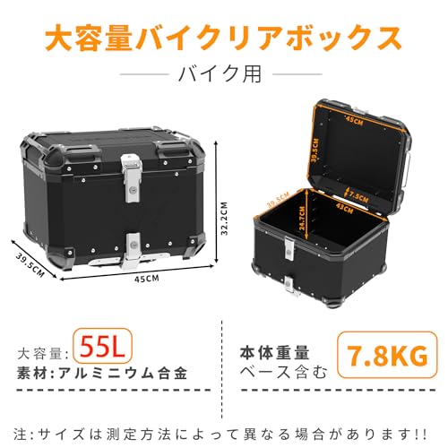 WoshiDer バイク用リアボックス 大容量 【 45L/55L/65L アルミ】 取付ベース付 簡単脱着 鍵2本付 フルフェイス対応 四角 バイクボックス トップケース 55L Black
