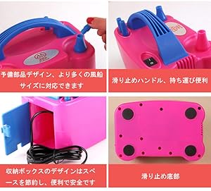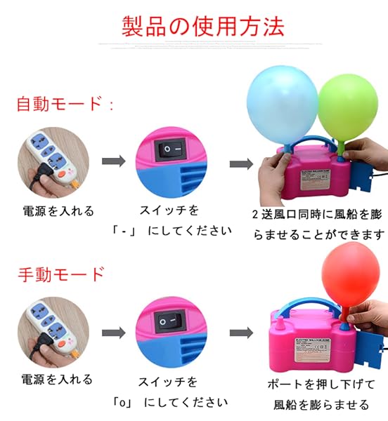❤自動ポンプの操作方法 プラグをAC 110V-120Vのソケットに接続してください。 方法1: スイッチを「o」にしてから、指で風船の端をつまんで、風船でインフレーションポートを覆います。 次に、インフレーションポートを押して空気を入れます。最後に、風船からインフレーションポートを離れて、空気を入れることを停止します。 方法2: 風船を連続的に空気を入れるには、スイッチを「 - 」にしてからインフレーションポートを風船で覆って空気を入れてください。停止する時はスイッチをオフにします。 付記:: スイッチの記号「 - 」は「オン」を意味し、「o」は「オフ」を意味します。 方法2で空気を入れるときは、インフレーションポートを押す必要はありません。 方法1は単一または少数の風船を空気を入れるのに適しており、方法2は多数の風船を連続的に空気を入れるのに適している。
