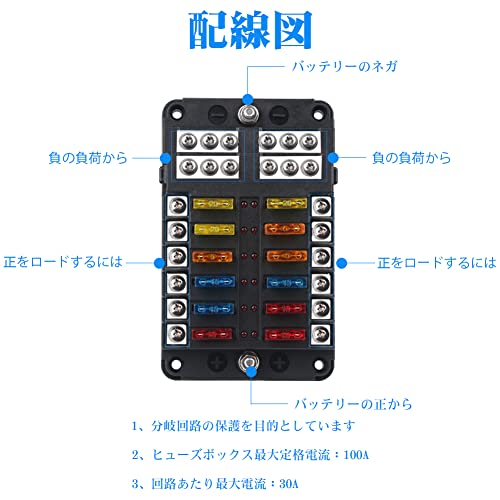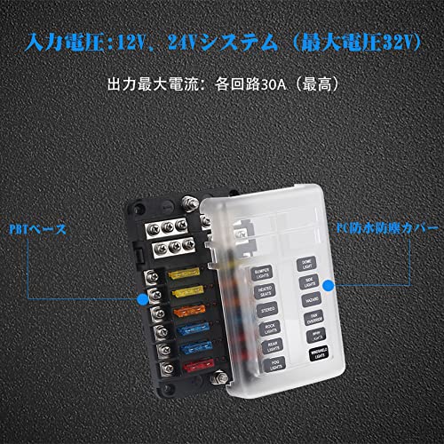 保险丝适用:标准刀片(ATO / ATC) 重量:279g 尺寸:138.2 x 85 x 36.5mm 输入电压:32V DC 输入额定电流:100A 输出最大电流:各电路30A(最高) 材质:PBT底座 + PC防水防尘罩 + 镀锡铜