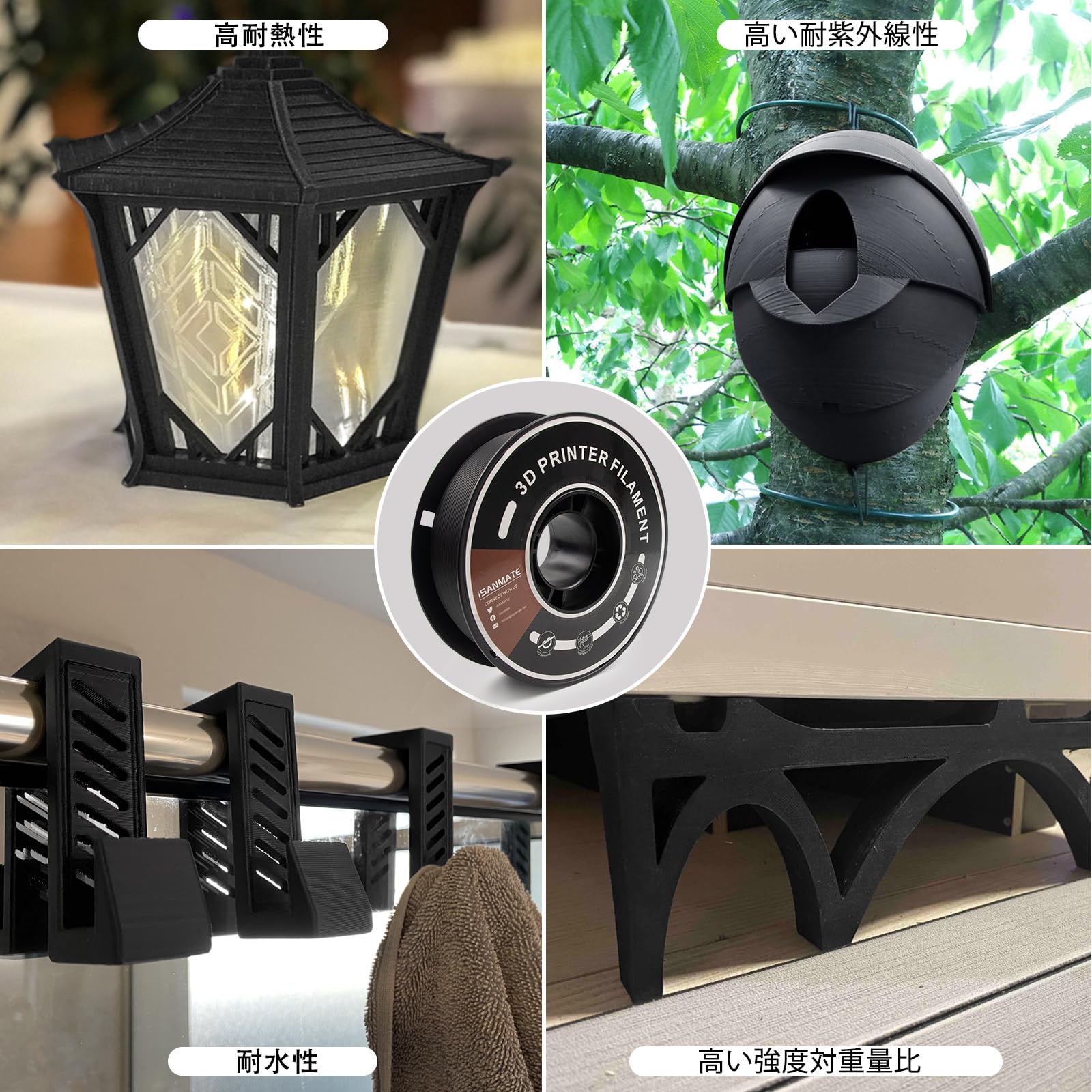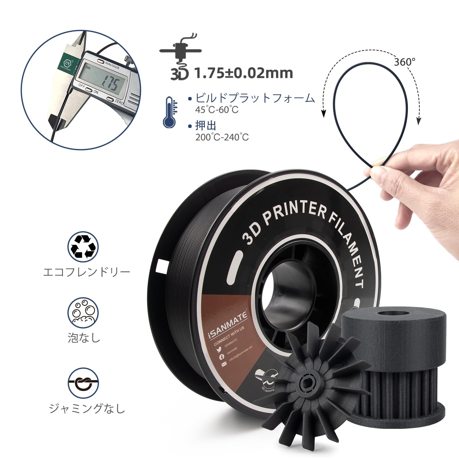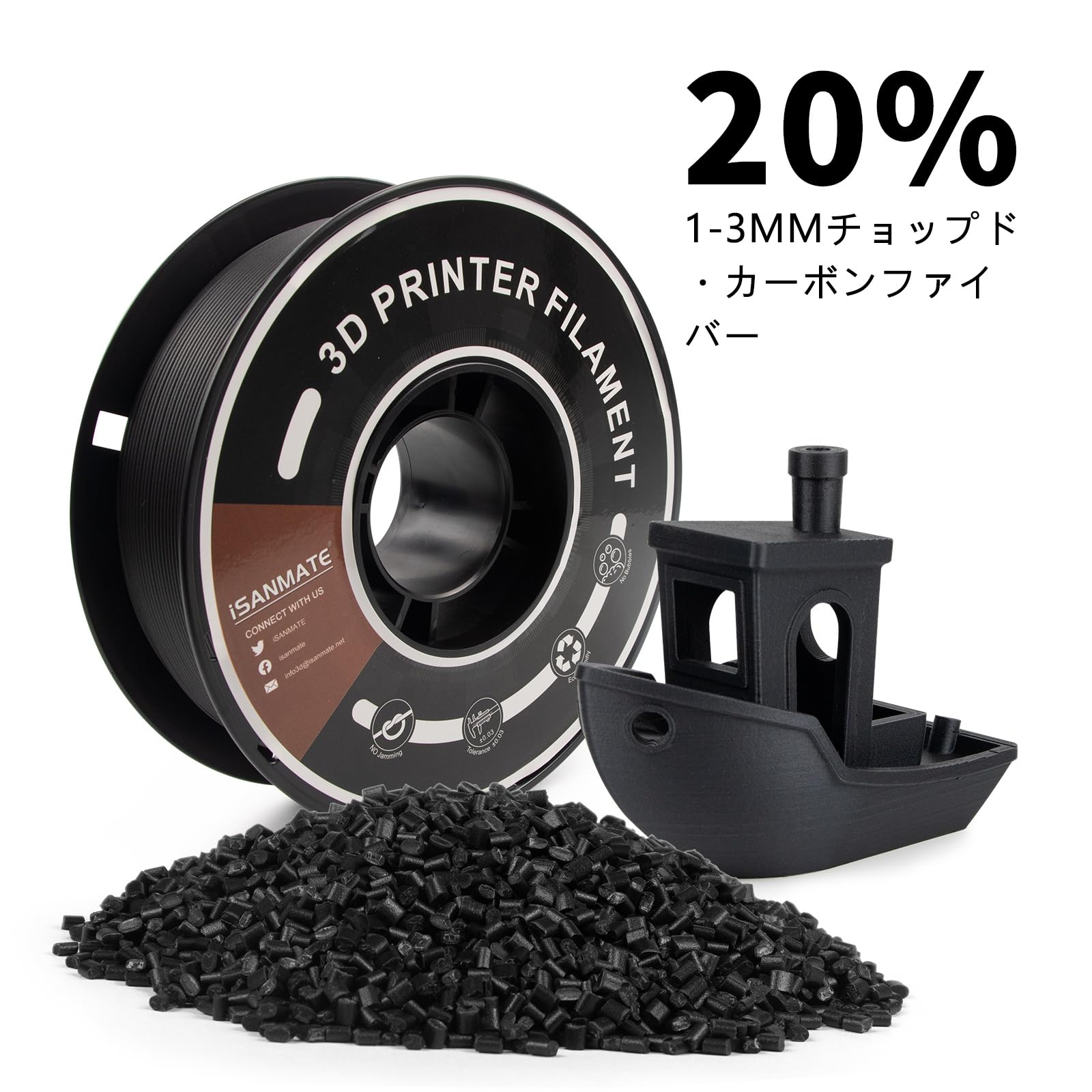 【超剛性PLAカーボンファイバーフィラメント】 iSANMATE PLAカーボンファイバーフィラメントは、通常のPLAフィラメントよりも高い剛性と強度を備えています。 20%のカーボンファイバーと80%のPLAの組み合わせにより、強靭性、耐摩耗性、耐引裂性が向上し、強度が必要なプリントに最適です。 【高精度、低収縮】 PLAカーボンファイバーフィラメント 1.75 高弾性、高強度の繊維素材から作られたカーボンファイバー粒子は、カーボンファイバーに寸法安定性を与え、反りや収縮を防ぎます。 中間層の密着性が良く、支持体の剥離が容易なため、反りのない印刷が可能です。 【推奨印刷温度】195~220℃(200℃推奨)、推奨印刷速度:40~130mm/秒、ホットベッド温度:45~60℃(50℃推奨)。 推奨ノズル径:≥0.4 mm(注:通常のPLAと比較して、カーボンファイバーフィラメントは非常に硬く、長期間の印刷では銅製ノズルが摩耗するため、ステンレス製ノズルを推奨)。 【安定した寸法公差】炭素繊維フィラメントの製造工程は、高度な直径測定と適応制御システムを採用し、高い寸法精度を保証します。 炭素繊維フィラメントの直径は1.75mmで、最小公差は±0.02mmで、市場のほとんどのFDM 3Dプリンタのマッチング要件に完全に準拠しています。 【プロの真空包装】ドイツの炭素繊維フィラメント原料、優れた性能。製品は24時間完全に乾燥され、梱包前に乾燥剤で真空密封されます。注意:カーボンファイバーフィラメントは湿気に弱いです。優れた印刷性能を維持するため、開封後は再密封可能な袋に入れて保管してください。