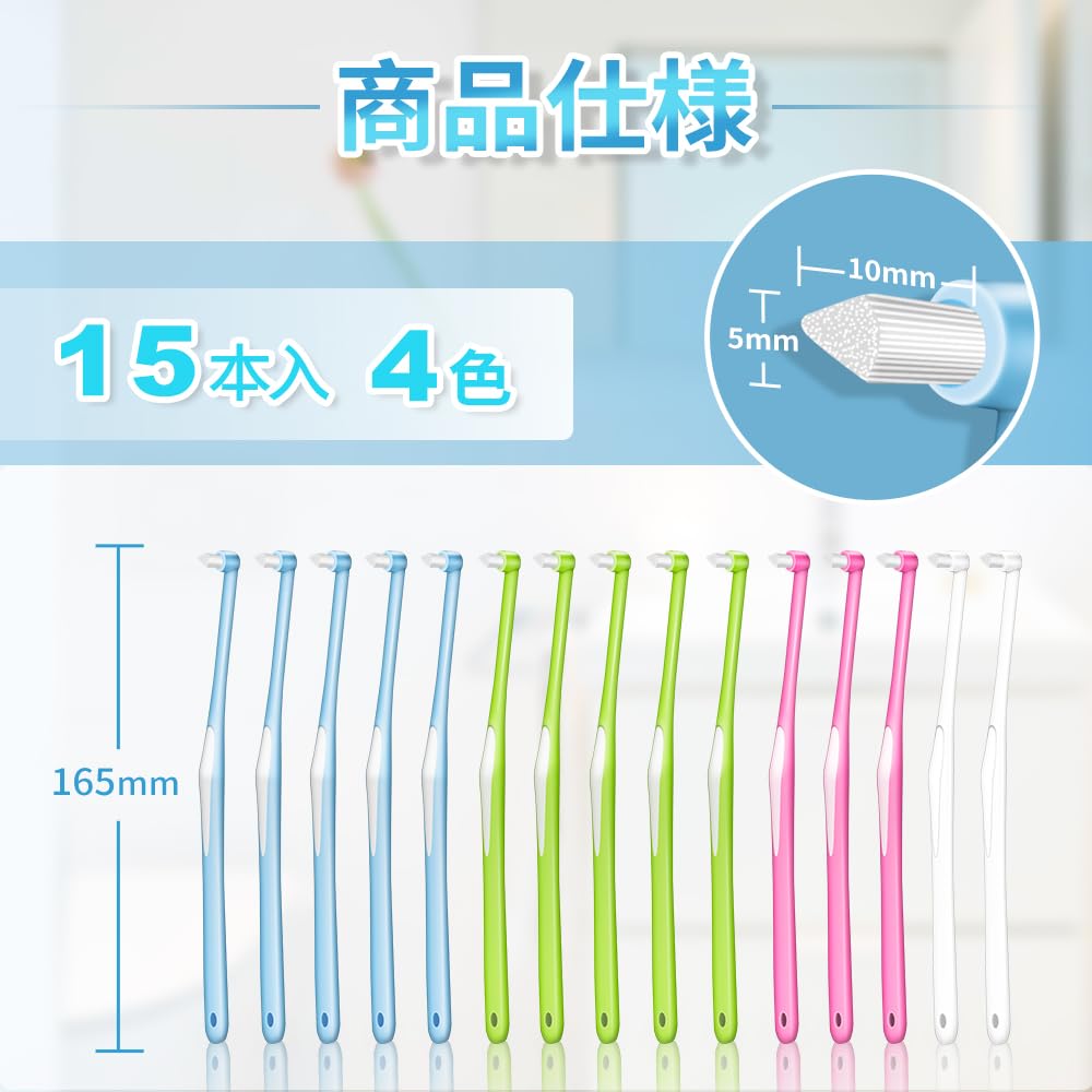 内容量: 15本入(4色)、毛の材質:柔らかのPBT、ハンドル:ポリプロピレン。適用者:大人と子供に適しています!極細柔らかので歯茎を傷めることなく、細かい部分の汚れを落としてくれる。