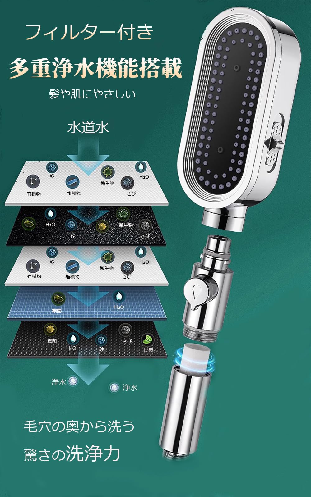 Beheycueについて Beheycueは新しいブランドですが、シャワーヘッドの調査と研究に専念し、実用的な機能とオシャレな設計と良い品質を一つシャワーへっどに溶け込み、我々はいつも「安全、実用、オシャレ、高品質」のシャワーへっどをお客様に提供できるように頑張ります。Beheycueは厳密な品質管理と良いアフターサービスを持って、お客様により良いシャワー・ヘッドとショッピング体験を提供することは日々に努力にしております。マイクロバブルシャワーヘッドについてマイクロバブルシャワーヘッドセット内容シャワーヘッド ナノバブル本体:1本亜硫酸カルシウムフィルター:2本アダプター4種:K·M·G·Oストレーナ:2本オーリング:2本日本語取扱説明書:1式シャワーヘッド マイクロナノバブル 塩素除去革新的な2重組み合わせ型散水板日本で初めて革新技術な2重組み合わせ型散水板を搭載したシャワーヘッド、手軽に美肌効果が実感できるの「マイクロナノバブル シャワーヘッド」です。水と空気を細かく分解し、約5億個のマイクロナノバブル(直径約0.001mm)を生成これにより、毛穴まで超微細な気泡が入り込み皮膚と頭皮の汚れを洗い流します。シャワーのお湯が肌の奥まで浸透することで、お肌が奥から潤い継続します。80%増圧可能なシャワー・ヘッドドイツからのデザインの革新的なシャワーヘッドで、頭部とハンドル部には超大型貯水空間が採用して、2重組み合わせ型散水板を採用して、3重の増圧技術を備えさせて、80%増圧が可能な高水圧シャワーヘッドです。NBRマッサージブラシ日本で初めてNBRブラシ搭載したシャワーヘッドで、NBR材質は耐高温と耐摩擦の特徵があり、静電気を防止できて、柔らかいで髪を引き裂くことはにくい、マイクロバブルを組み合わせて、軽く力を入れることだけで頭皮をリラックスさせると清潔効果があります。塩素除去・角度調節可能・シャワーフック付き当社のシャワーヘッドには2つカートリッジが搭載されており、水に含まれる塩素や雑菌を取り除き、同時に肌の角質を柔らかくしてくれ、髪や肌への悪影響を減らすことができます。角度調整シャワーフックが付属しており、90°に調節可能、様々な角度に対応できます。手元止水・3段階モード・水量調節可本シャワーヘッドは3つの節水シャワーヘッドの機能も備えており、ワンタッチ止水機能(手元で止水ができる)、3段階水流モード調整機能(総合モード・レインモード・ミストモード)、水量調整機能(ワンタッチボタンを前後に調節して水量が調節できる)を搭載した、多様な機能を備え、片手で操作可能で非常に便利です。