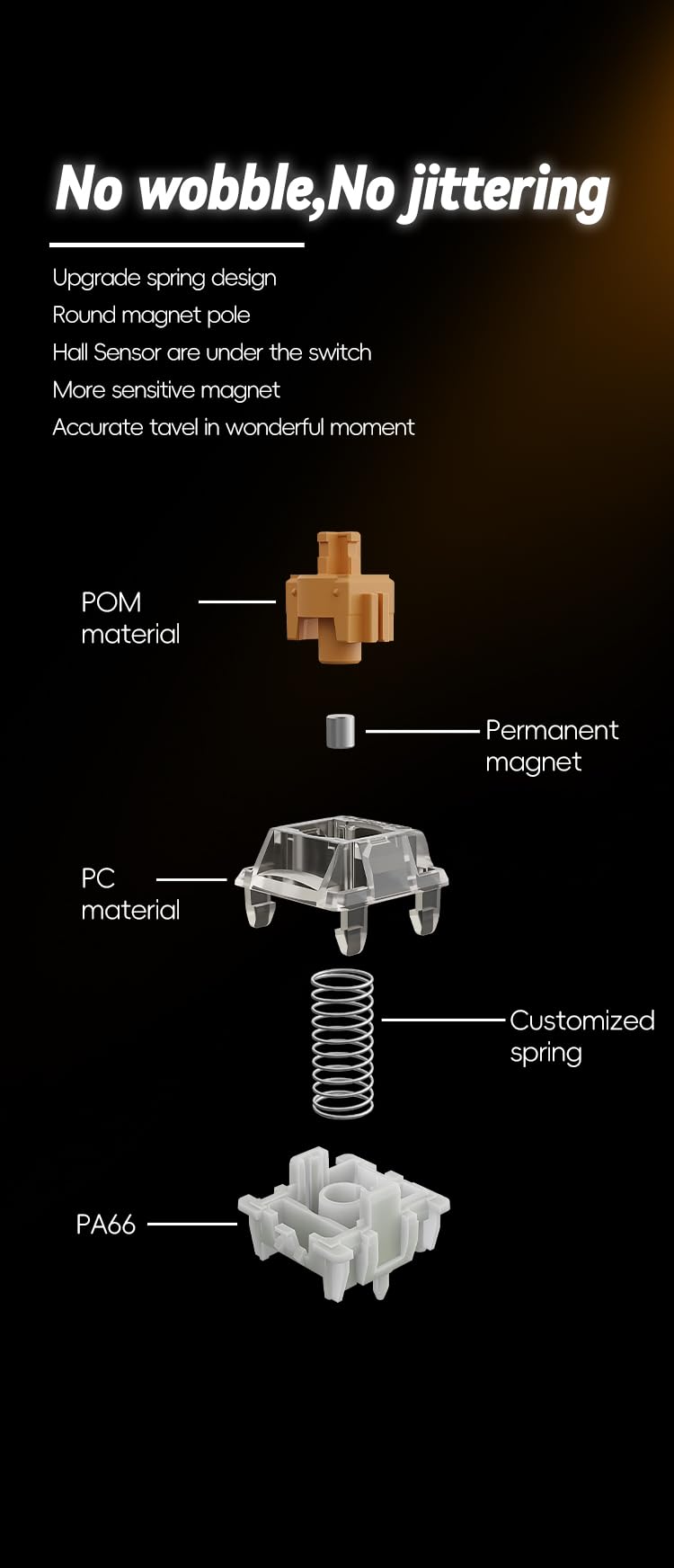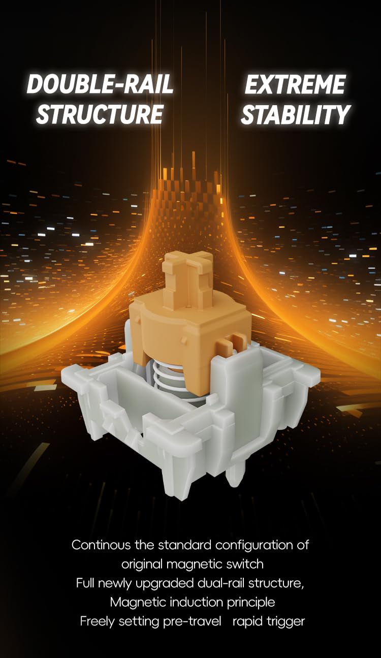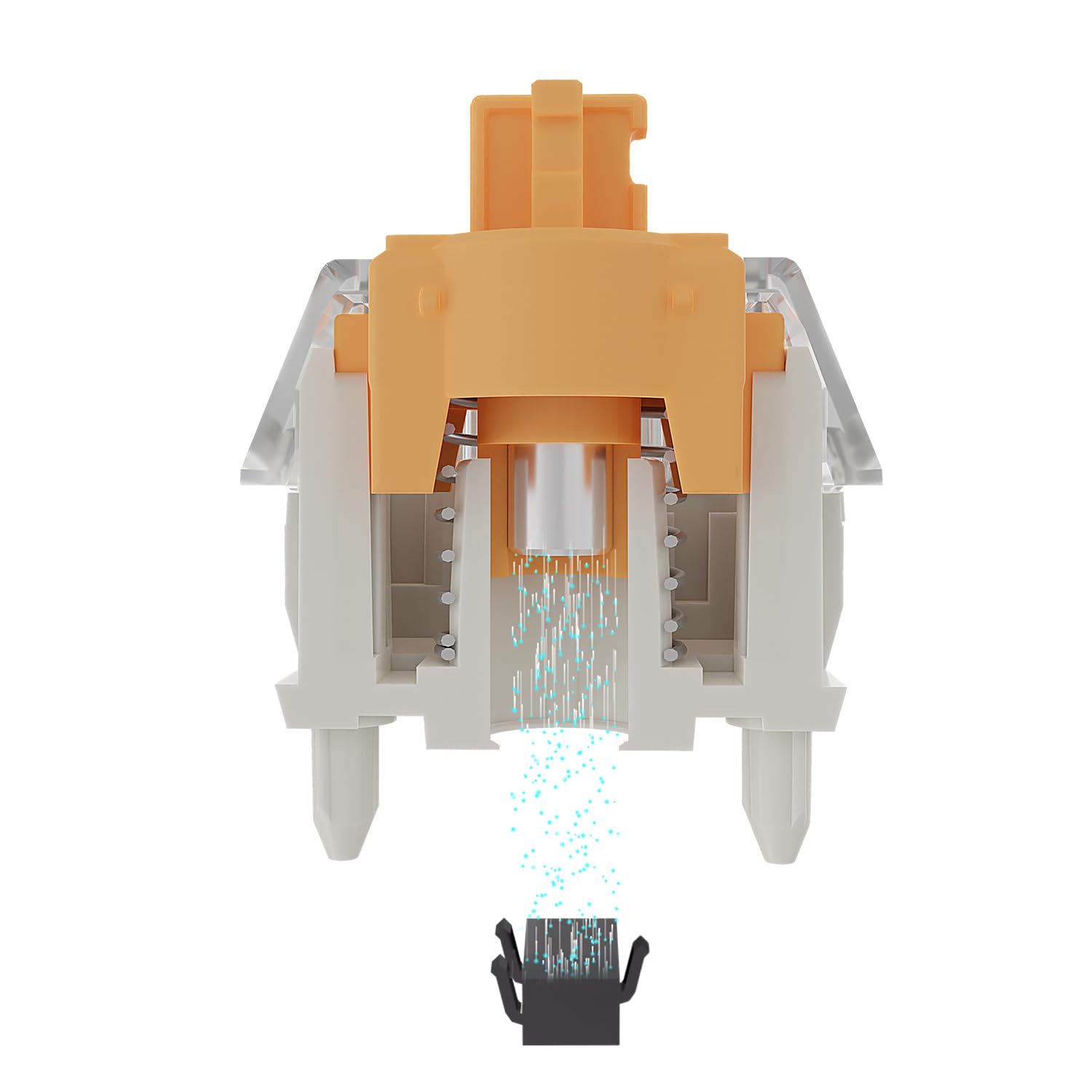 このKS-20デュアルレールGATERONマグネットオレンジキーボードスイッチは、ブラックテクノロジーです。ホールセンサーを利用した無接点マグネットスイッチです。GATERONの特許は機械式キーボードスイッチに磁気誘導技術を応用しています。この磁気スイッチの応用は、機械式スイッチの打鍵感を再び向上させるだけでなく、伝導技術の自由な設定移動も際立たせます。