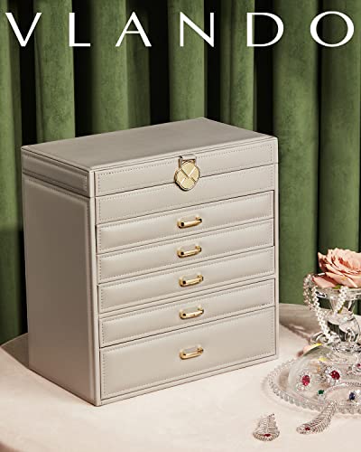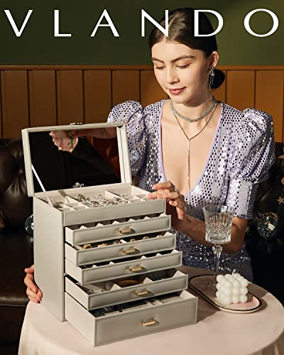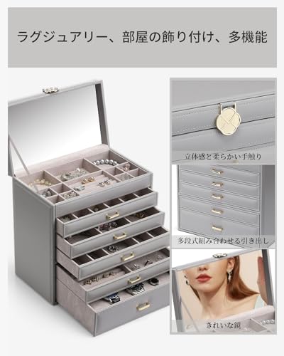 Vlando 大容量 ジュエリーボックス - 6段 アクセサリー収納ケース 鏡付き アクセサリー イヤリング ネックレス 腕時計 指輪収納の宝石箱 (グレー)