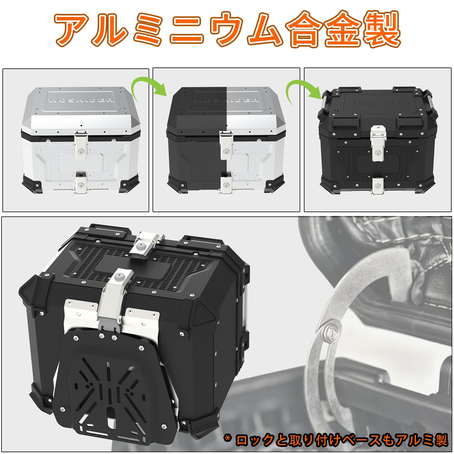 WoshiDer バイク用リアボックス 大容量 【 45L/55L/65L アルミ】 取付ベース付 簡単脱着 鍵2本付 フルフェイス対応 四角 バイクボックス トップケース 55L Black