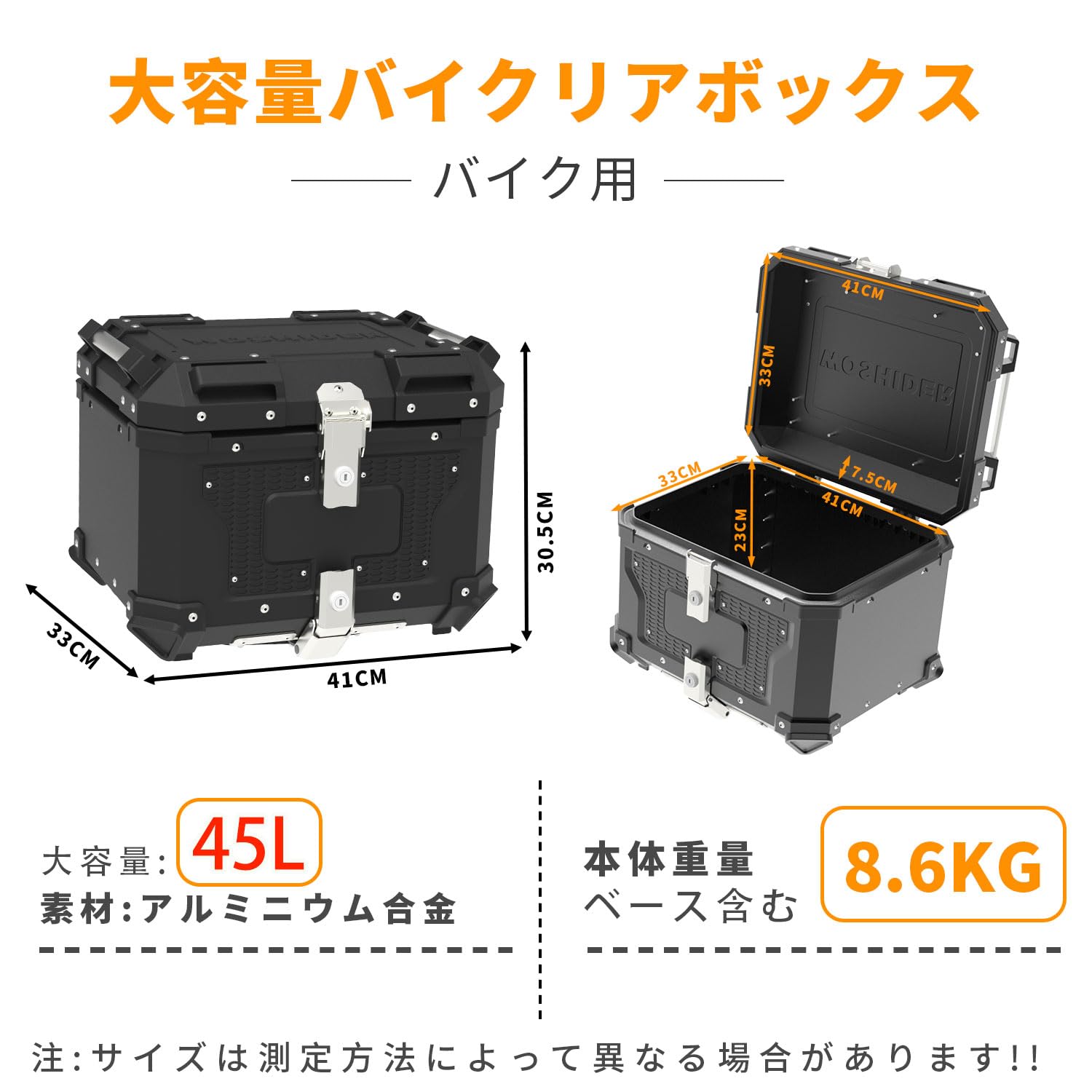 OFFBAIKU バイク用リアボックス トップケース【45L/55L/65/80L・アルミ製】リアボックス オートバイボックス バイクボックス パニアケース バイク用 バイクケース 独創的なロック 大容量 アルミ製 軽量 簡単脱着 取付ベース付 キーロック可能 防犯対策 鍵2本付 汎用 四角 ツーリング/キャンプ/通勤/出前/デリバリー等対応 ブラック 45L