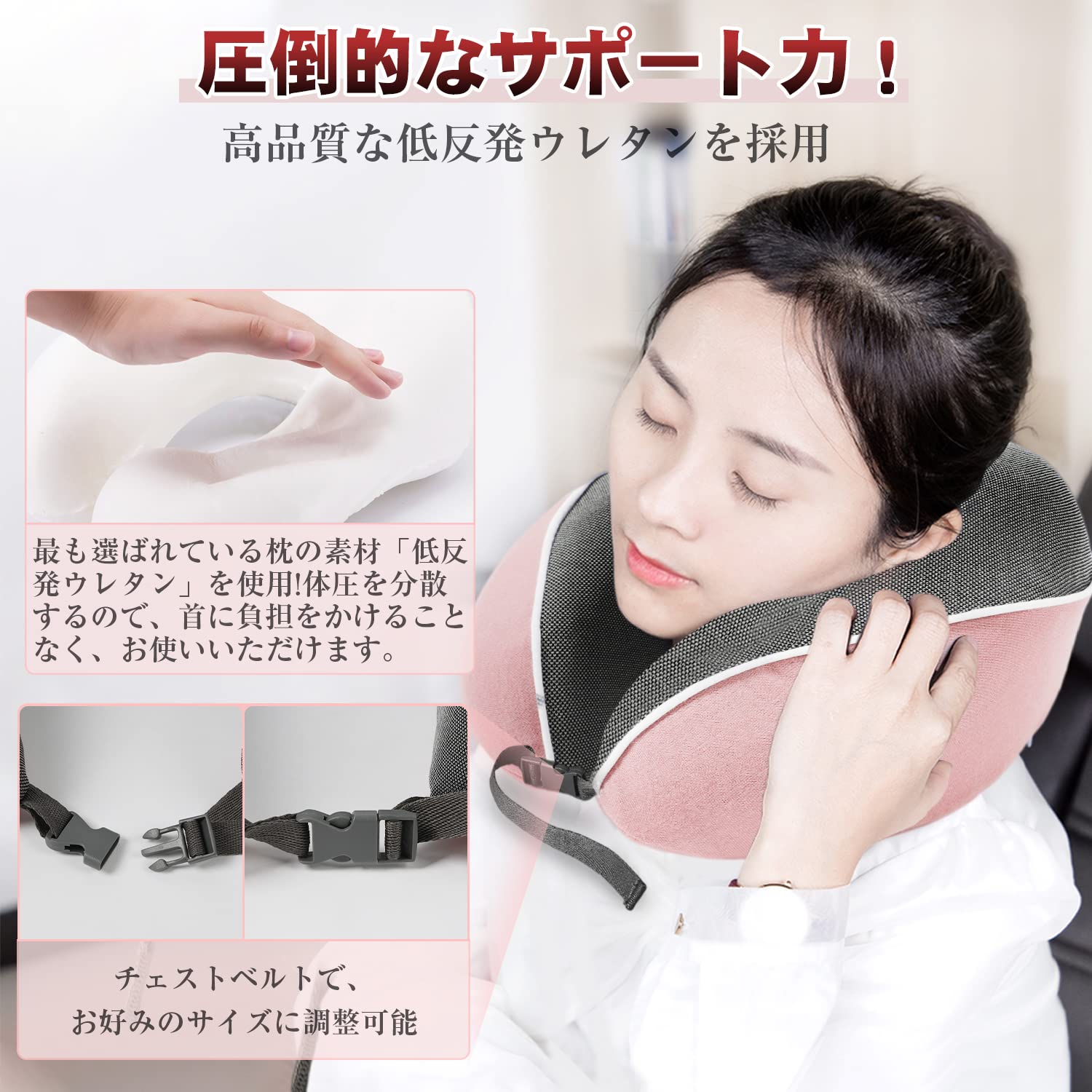 まくらには低反発で通気性のウレタンフォームを使用しております。カバーは100%コットンなので肌が弱い人でも使えます。また、空気を入れる必要がないので子供にも使いやすいネックピローです。