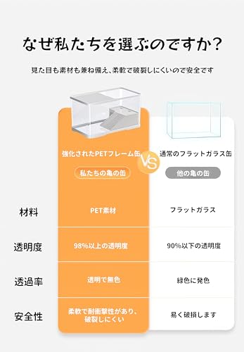 1.【高品質の素材で作られており】亀を安心して飼うことができる,グレードのPPプラスチック素材を採用、冬は暖かく、夏は涼しく、丈夫で耐摩耗性があり、耐久性、耐腐食性、無毒性、無味であり、可愛いの外観は様々な装飾と簡単にマッチさせることができる 2.【素敵なデザイン】亀逃しを防止し、取り付けが便利で、カラーはクリーム、オレンジ、ミントグリーンの三色があり.S(38*24*14cm)M(50*27.6*17.9cm)、L(66*35*18cm)、三つの規格を採用、様々な選択を与えます。商品ページの写真はご参考になりますので、サイズについて、物差しなどで計りて見ることを勧めます。 3.【水換え簡単】水切り設計で亀の糞や食べ残しが底部に落す、水換えしやすく汚れてもお手入れ簡単。排水バスケットを直接持ち上げて、造園の損傷を恐れず、直接すすぎ、時間と労力を節約します。 4.【水陸両用】遊泳エリア・階段・エサ台・日向ぼっこ台と、バリエーションに富んだスペース分けがされた水槽。十分なスペースがあり、ライトや各種飼育用品が設置しやすいのもうれしいところ。動き回るスペースが大きいので亀の運動不足も解消できます。 5.【ダブル給餌トラフ設計】肉と野菜が一致し、飼料とスナックが分離され、カメはより栄養価が高く、健康的かつ迅速に成長します。造木をセットできるくぼみなどカメにも飼い主にもうれしい工夫が詰まっています。 6.「DIYコーナー」お好みで石ころや植物を飾り、カメさんの楽園を作りましょ.ご不明な点がございましたら、お気軽にお問い合わせください、24Hで問題を解決するために返信いたします。商品ページの写真はご参考になりますので、サイズについて、物差しなどで計りて見ることを勧めます。