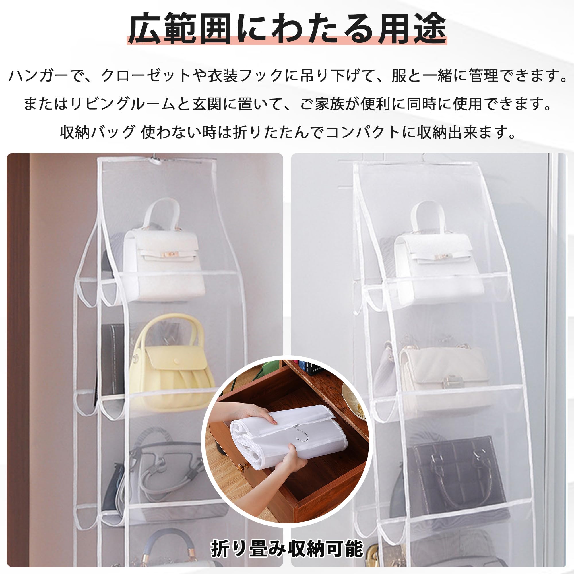 使わない時は吊り下げバッグ収納を折りたたんでスリムに収納することができます。バッグはもちろん、服や靴、生活雑貨、ストール、手袋などの小物を収納可能です。クローゼット、玄関、キッチン、浴室、押入れなど場所に最適です