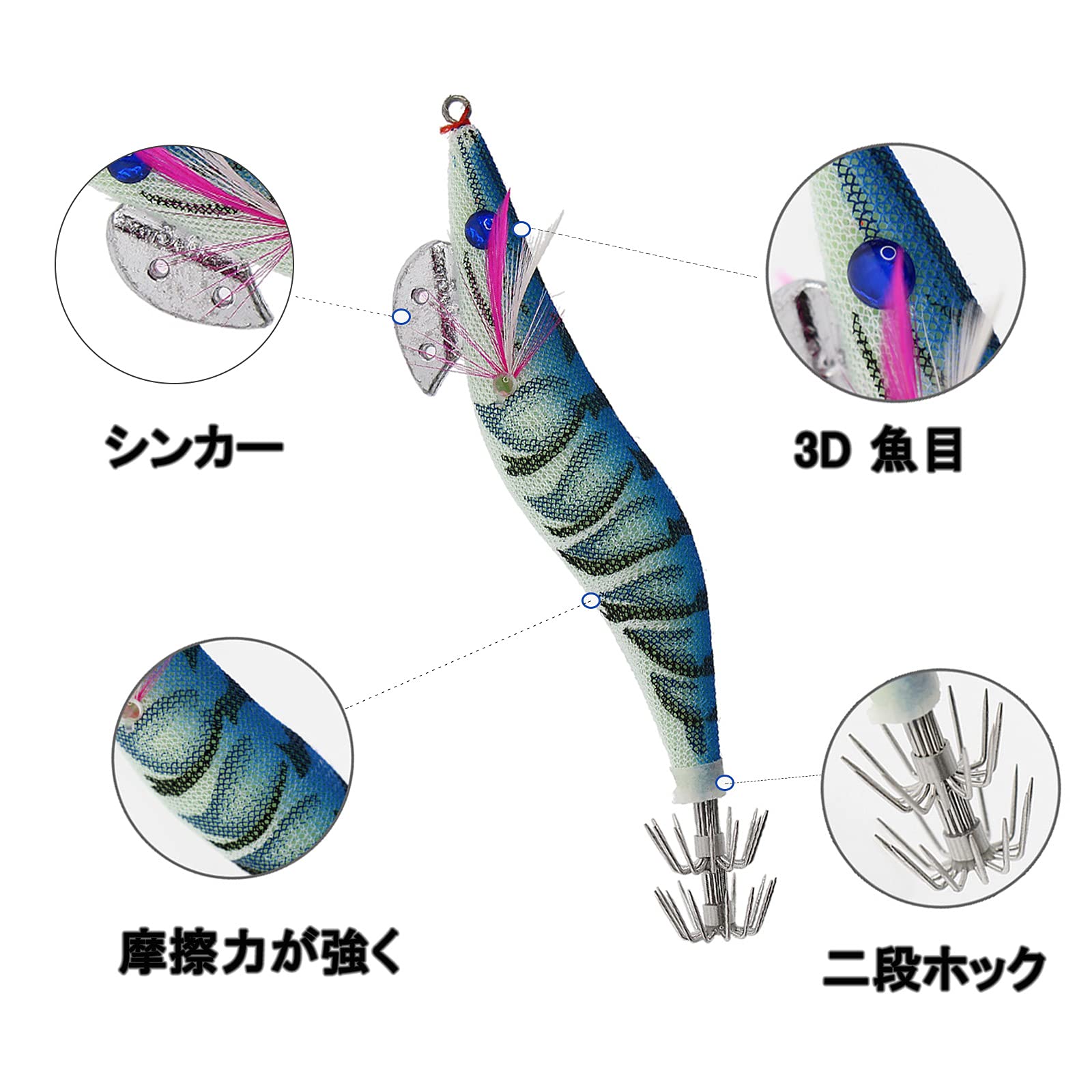 3D眼+本物にそっくりヒゲ+鉛の落ちもの、本物にそっくりデザインですので、本当のエビに見えます。ヒゲと鉛の落ちものは彼らの泳ぎ方を改善します。