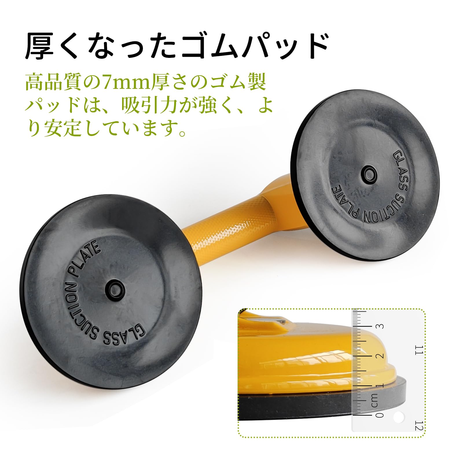 サクションリフターの水平耐力55kg、垂直耐力45kg、超強力な吸着力です。また、吸盤の直径は123mm、吸着部分のゴム盤の厚さは7mmとなり、接着面が広い、強力に対象物に吸着して脱落しにくいです。高品質な厚いゴムを採用して吸盤は滑らかで、鉄板やガラス面・車体を傷つけることはありません。