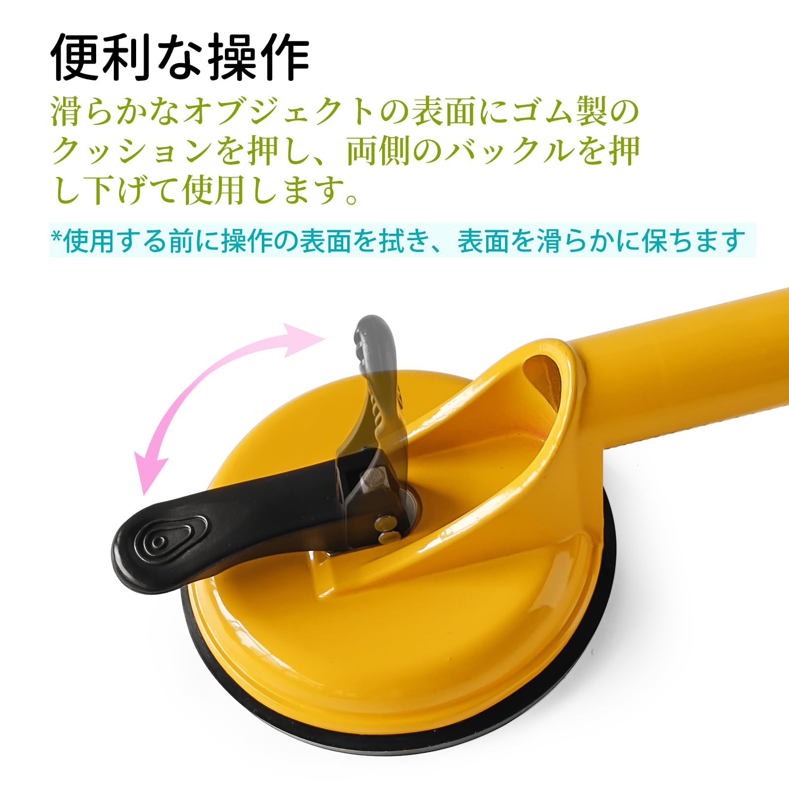 ▶ 吸盤の表面は、常にキレイな状態で使用してください。ゴミやホコリが付いた状態では、吸着力が低下し、対象物が落下する恐れがあります。