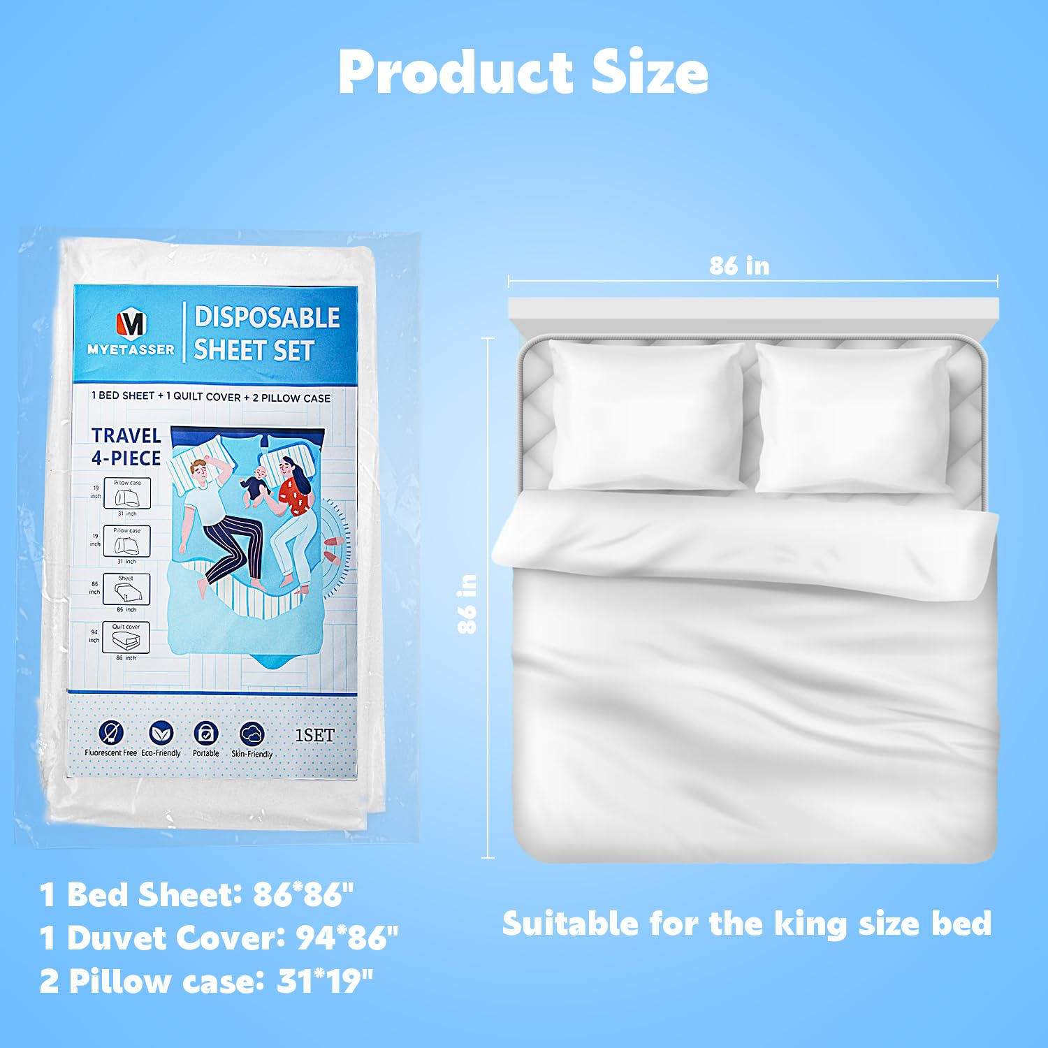 寝具の各セットには、シーツ 1 枚 (220x220cm)、掛け布団カバー 1 枚 (240x220cm)、枕カバー 2 枚 (80x50cm) が含まれます。 このXXXL使い捨て寝具は、ほとんどのベッドに適しています。