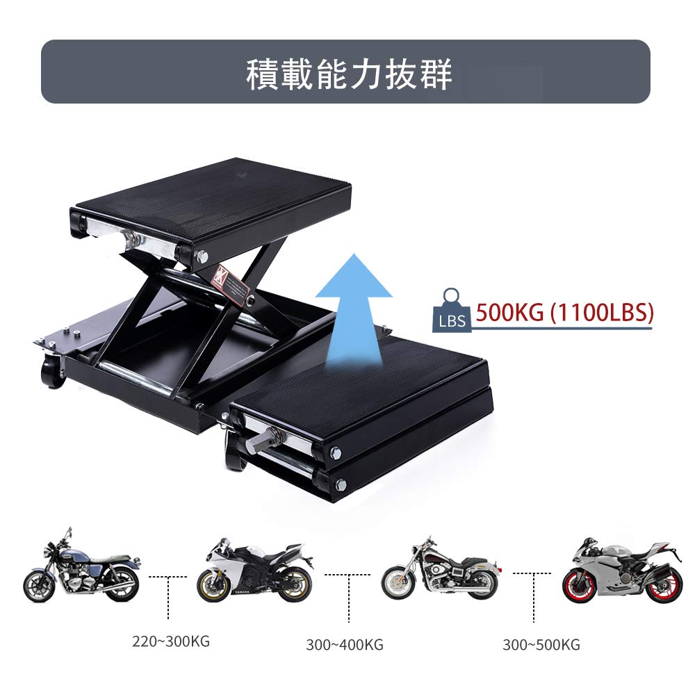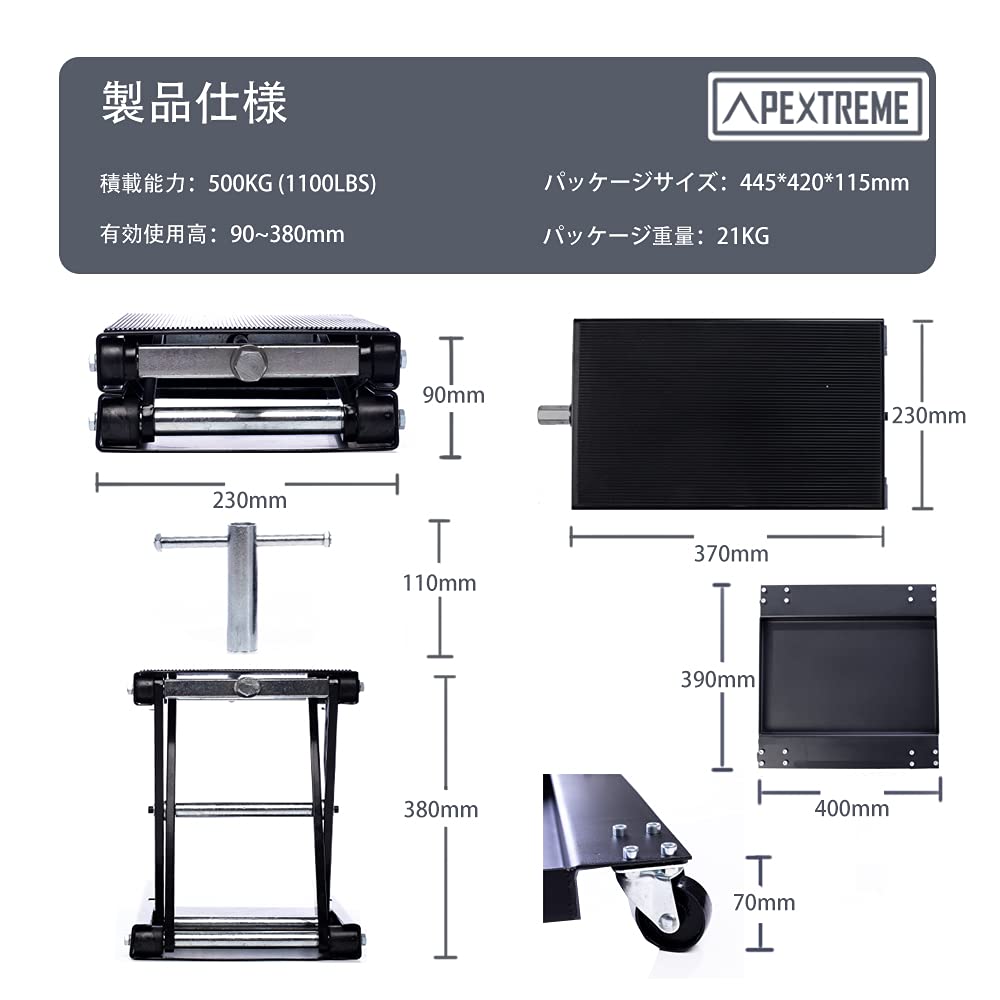 Apextremeのバイクジャッキは優れた安定性と安全性を持っています。簡単なリフト機構を通して、安全で、手軽にバイクのメンテナンスを行います。フロードバイク、トライアルバイク、モタードバイクと多くの車種に対応できます!ジャッキアップの必需品! !