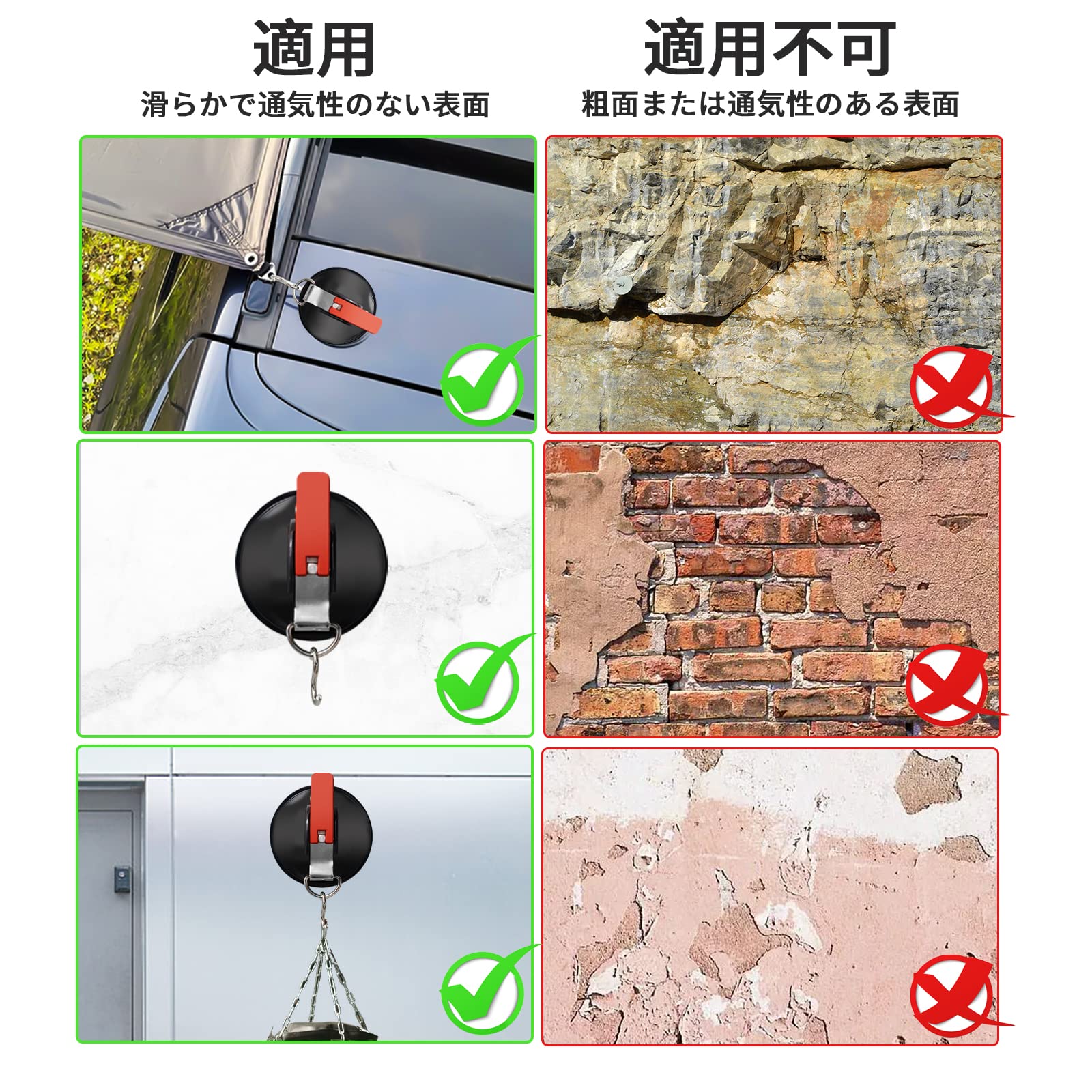 • 吸着フックは殆どの物を固定することができる優れた方法です。いつ落ちるかの不安に悩まされることはもうありません。カーサイドタープやサンシェードの固定として使用できるだけでなく、屋内外での使用やカーキャンプや旅行などでの仮設アイテムフックとして使用できます。アウトドアに最適ですが、家でもバスルームやキッチンのフックとしても使用することができます。