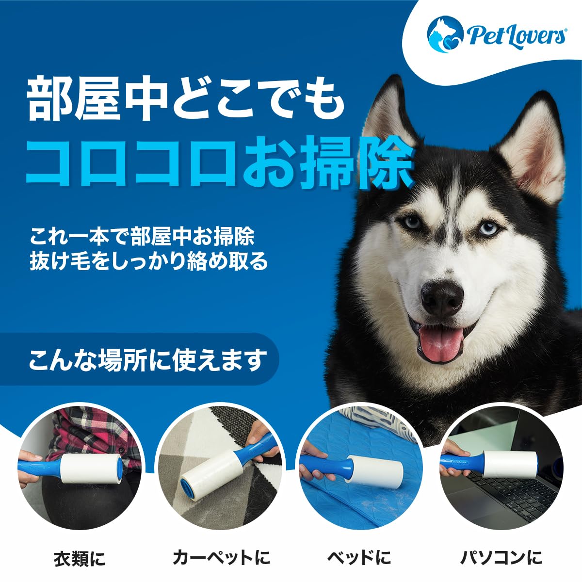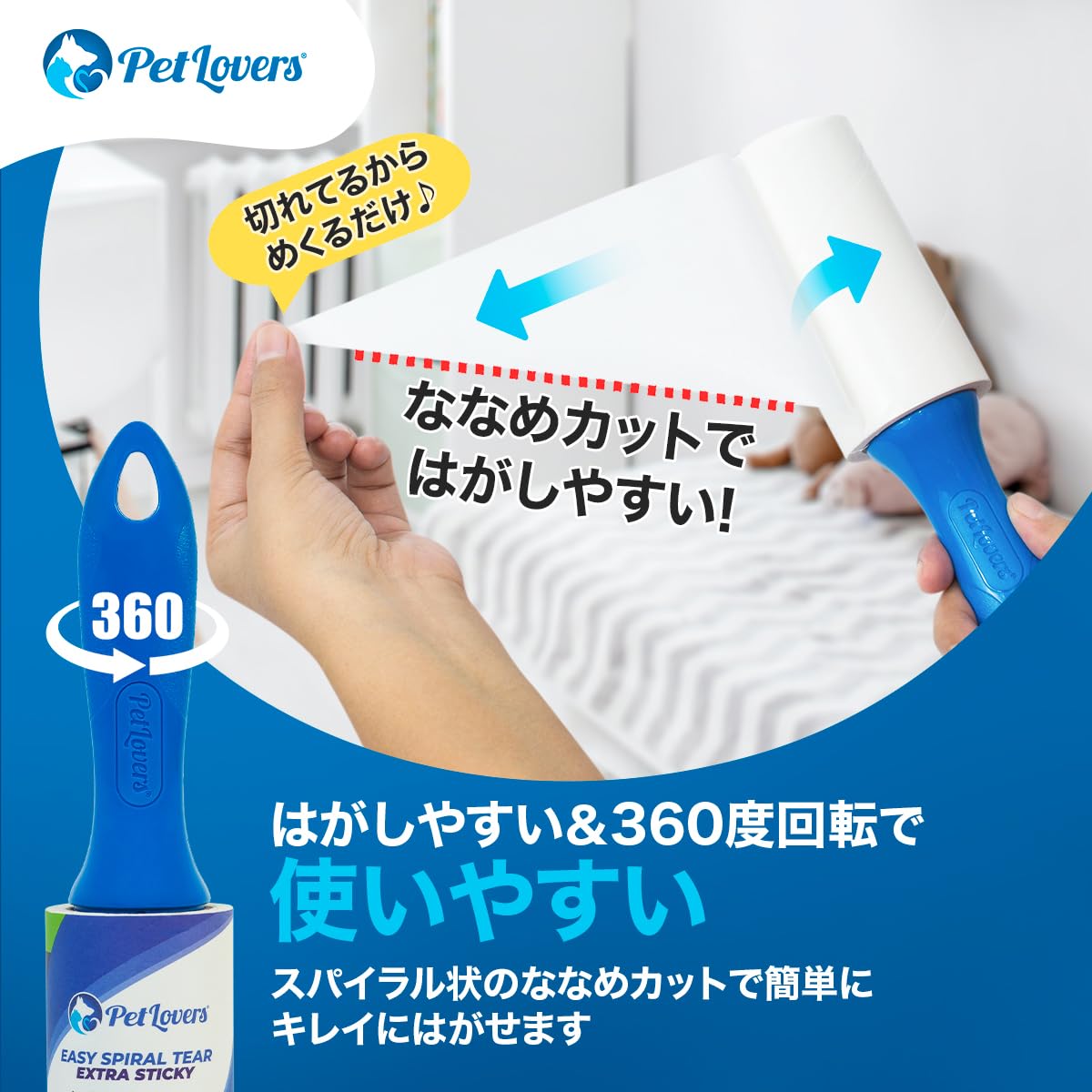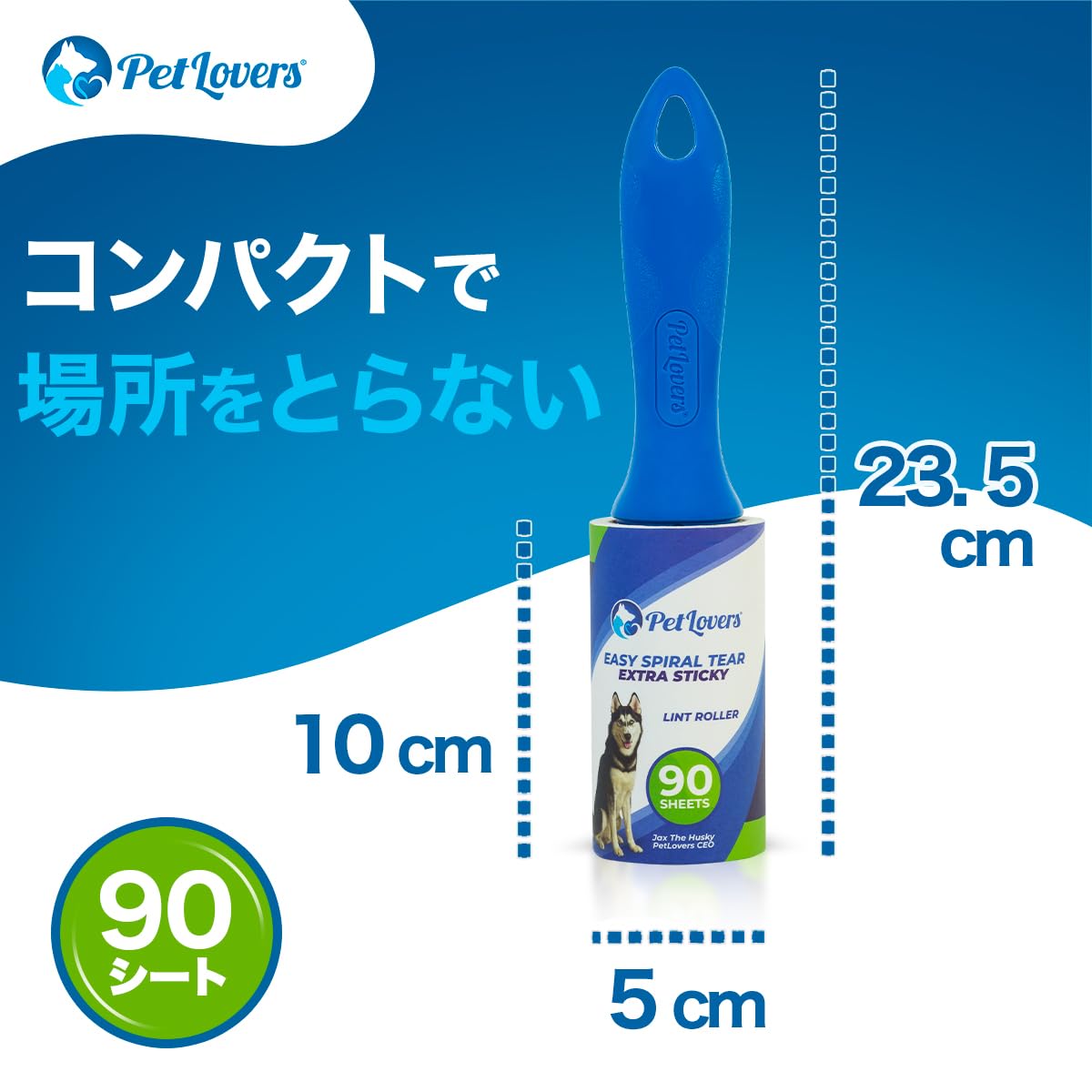 PetLovers(ペットラバーズ)超強力 粘着ローラークリーナー5本セット。ななめカットでめくりやすい、ペットの毛のお掃除にピッタリのリントローラー本体1本+替え3本 (計4本セット - 360シート)です。 コロコロと滑らかな回転で使いやすさ抜群のローラークリーナー本体1本を、ななめカットではがしやすい強力粘着シートのスペア3本とセットにしてお届けします。 収納もカンタンな小型サイズ。衣服やカーペットに付着した、ペットの抜け毛や小さなホコリまで、お掃除の様々な場面にお使いいただけます。特に家中のあらゆる場所に付着しがちなペットの毛にも、ペットラバーズのローラークリーナーならサッとすばやくお掃除できます。特に普段ペットの抜け毛取りで猫ブラシなどをご使用されている場合には、細い毛があらゆる場所に付着しがちなため、すばやくカンタンにお掃除できる当商品はおススメです。 粘着式のローラークリーナー1本とスペアの替えが3本(計4本・全360シート)がセットになっています。ななめにカットされたスパイラルな形状で剥がしやすい粘着シートが特徴です。改善に改善を重ね、今までで一番使いやすいローラークリーナーとなりました。 また、当社では、トレードマークになっている犬の執行役員ハスキー犬のジャックスがたくさん落としていく抜け毛を利用して商品の性能を検証、強力な粘着力で綺麗に拾いあげることが確認できました。もちろんペットの抜け毛だけでなく、ホコリや小さなゴミにもお使いいただけるため、ちょっとしたお掃除にも便利です。 スムーズにコロコロ回転するようにデザインされたローラーでストレスフリーなお掃除を実現、他の類似製品で使いにくさが気になったことのある方にもオススメできる仕様になっています。 PetLovers(ペットラバーズ)の超強力な粘着クリーナーは、身だしなみツールとしても強い味方で、衣類やカーペットなどの家具についたペットの抜け毛やホコリをすっきりと取ることができます。