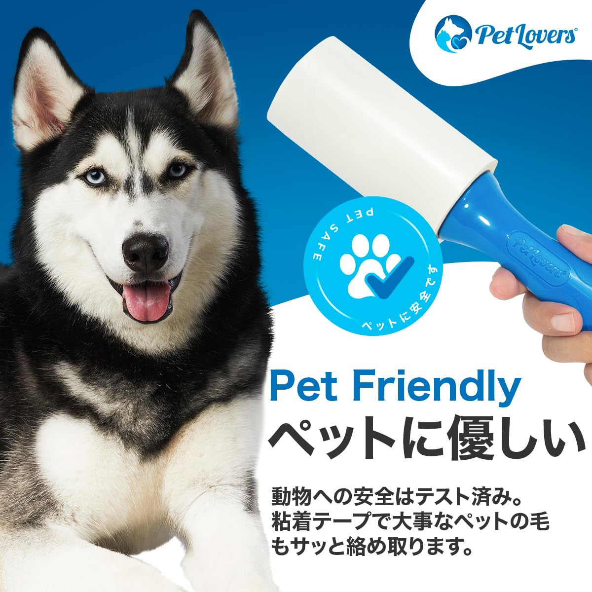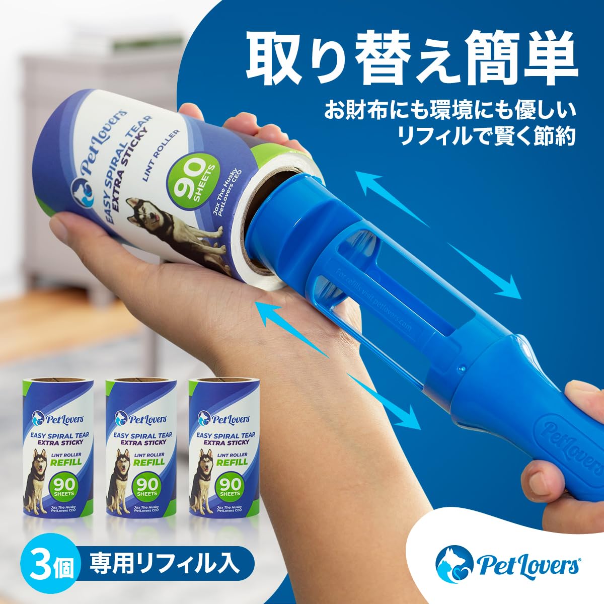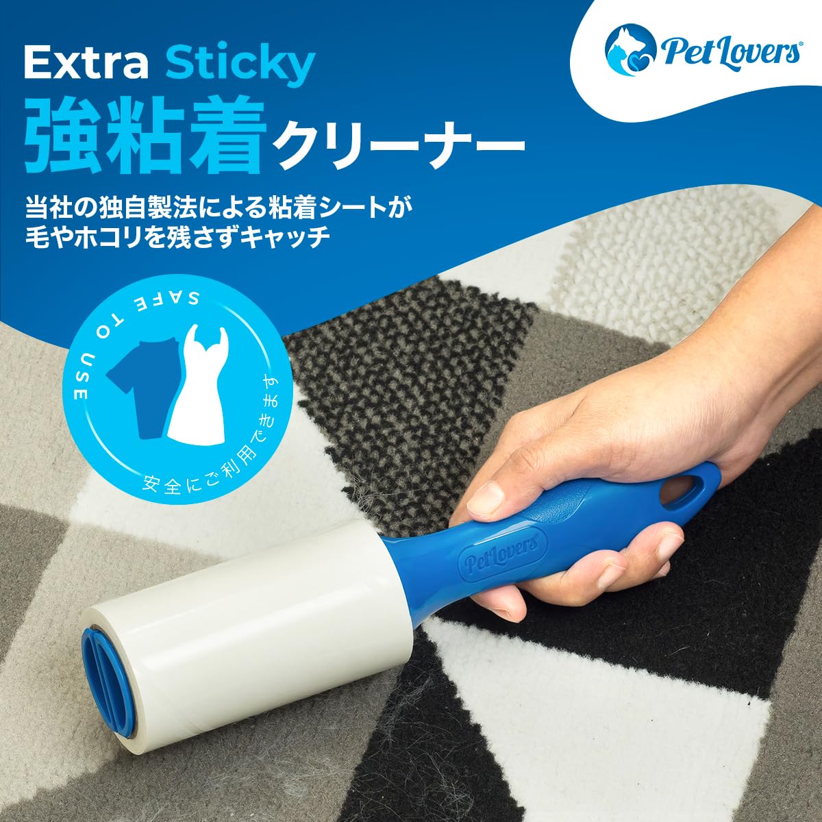 PetLovers(ペットラバーズ)超強力 粘着ローラークリーナー5本セット。ななめカットでめくりやすい、ペットの毛のお掃除にピッタリのリントローラー本体1本+替え3本 (計4本セット - 360シート)です。 コロコロと滑らかな回転で使いやすさ抜群のローラークリーナー本体1本を、ななめカットではがしやすい強力粘着シートのスペア3本とセットにしてお届けします。 収納もカンタンな小型サイズ。衣服やカーペットに付着した、ペットの抜け毛や小さなホコリまで、お掃除の様々な場面にお使いいただけます。特に家中のあらゆる場所に付着しがちなペットの毛にも、ペットラバーズのローラークリーナーならサッとすばやくお掃除できます。特に普段ペットの抜け毛取りで猫ブラシなどをご使用されている場合には、細い毛があらゆる場所に付着しがちなため、すばやくカンタンにお掃除できる当商品はおススメです。 粘着式のローラークリーナー1本とスペアの替えが3本(計4本・全360シート)がセットになっています。ななめにカットされたスパイラルな形状で剥がしやすい粘着シートが特徴です。改善に改善を重ね、今までで一番使いやすいローラークリーナーとなりました。 また、当社では、トレードマークになっている犬の執行役員ハスキー犬のジャックスがたくさん落としていく抜け毛を利用して商品の性能を検証、強力な粘着力で綺麗に拾いあげることが確認できました。もちろんペットの抜け毛だけでなく、ホコリや小さなゴミにもお使いいただけるため、ちょっとしたお掃除にも便利です。 スムーズにコロコロ回転するようにデザインされたローラーでストレスフリーなお掃除を実現、他の類似製品で使いにくさが気になったことのある方にもオススメできる仕様になっています。 PetLovers(ペットラバーズ)の超強力な粘着クリーナーは、身だしなみツールとしても強い味方で、衣類やカーペットなどの家具についたペットの抜け毛やホコリをすっきりと取ることができます。