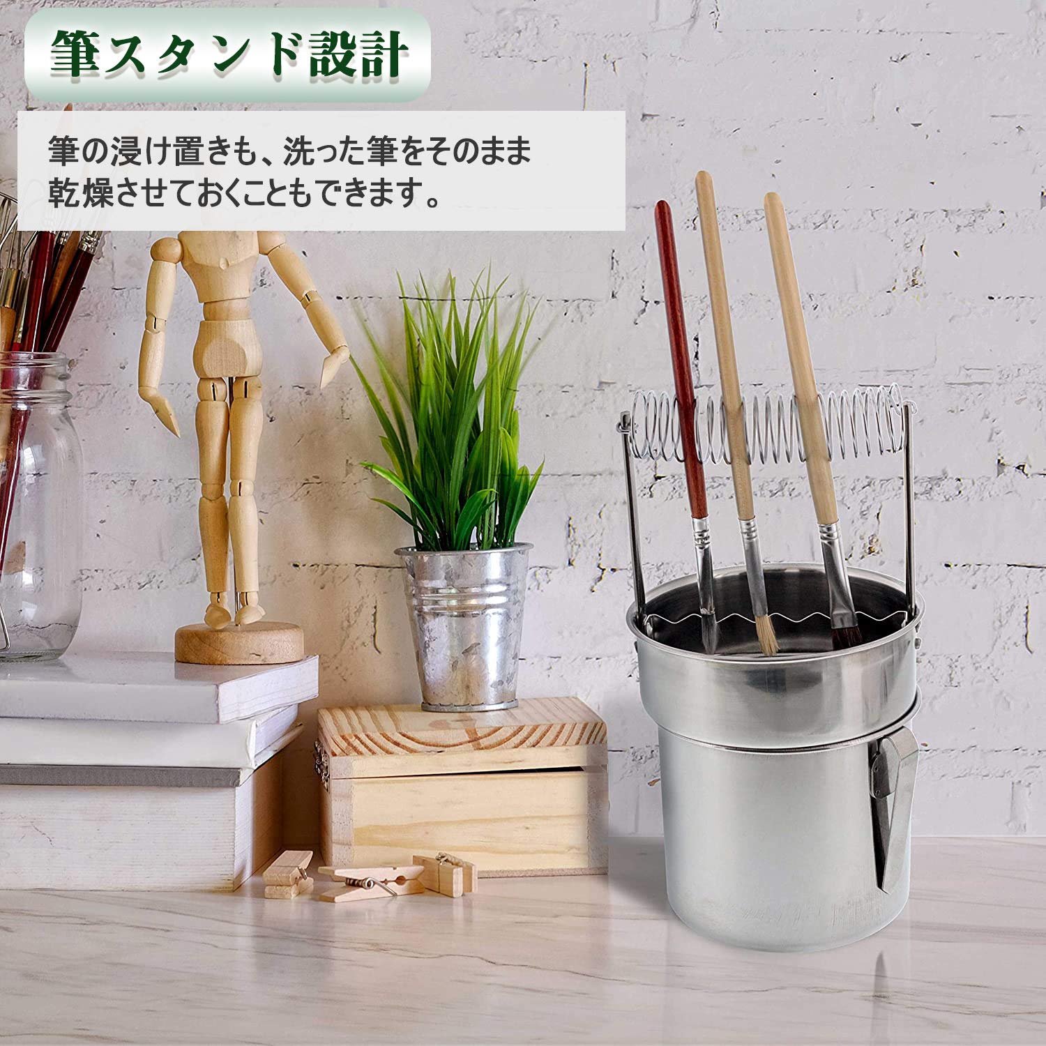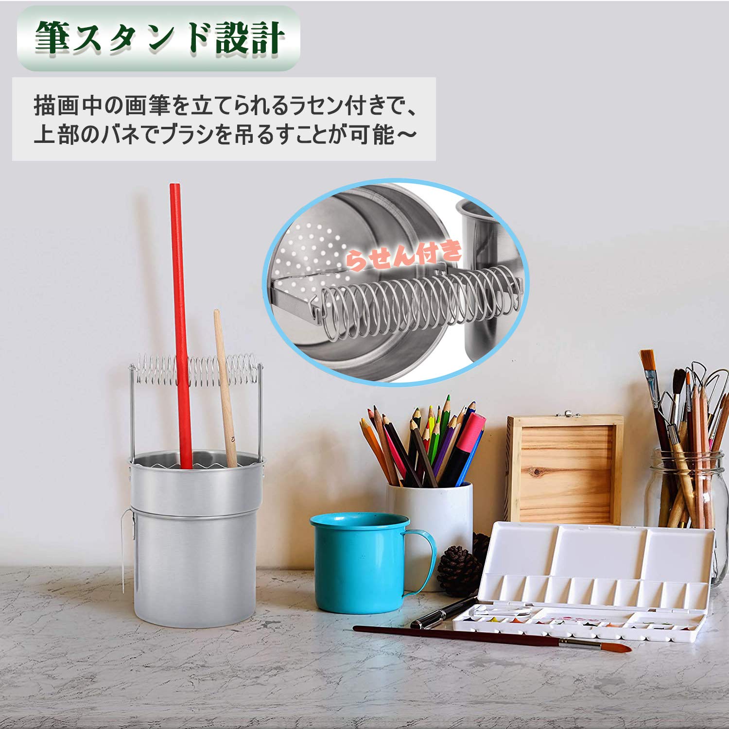 描画中の画筆を立てられるラセン付。上部のバネでブラシを吊るすことができ、洗った筆もそのまま乾燥させておくことができます。