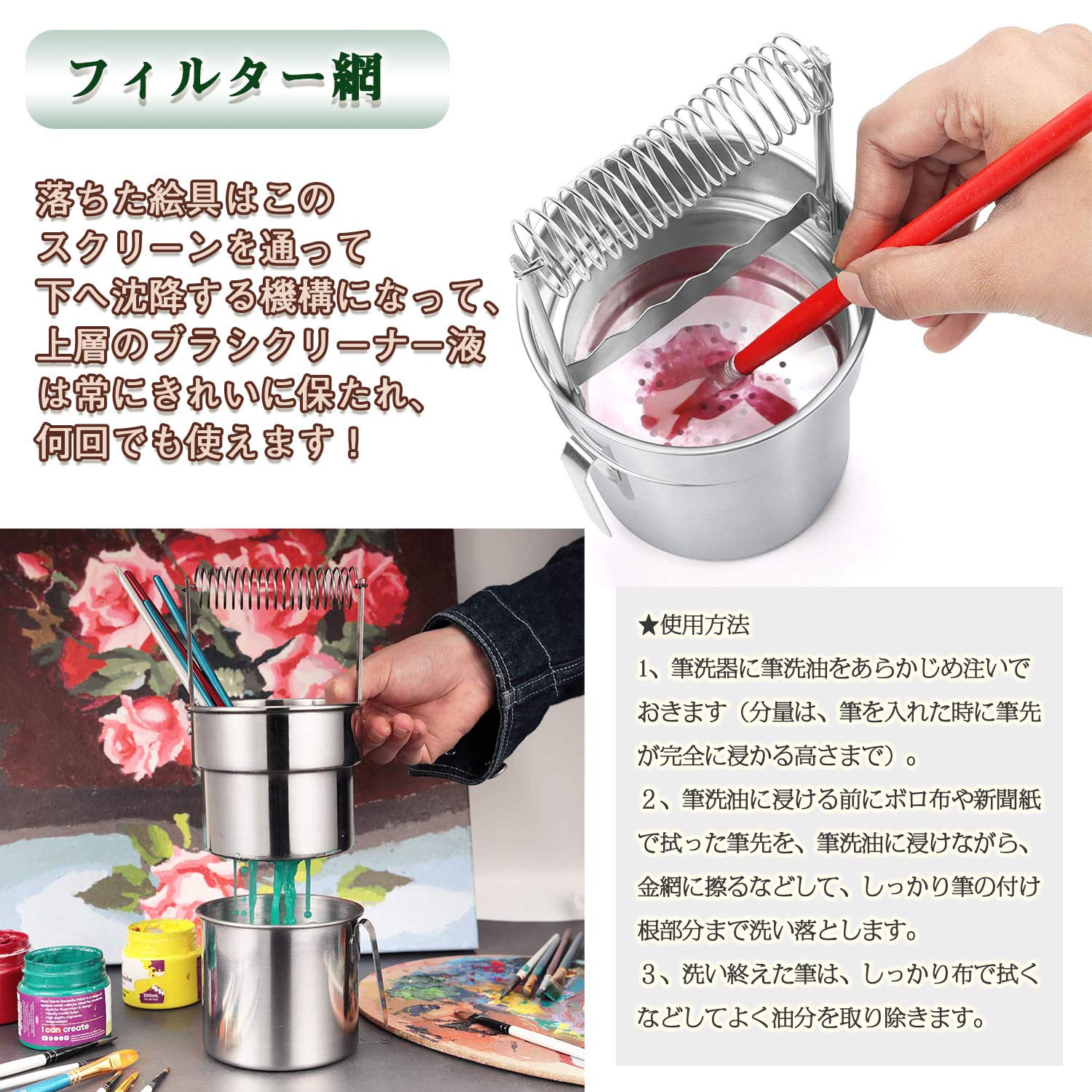 内部に油こし用の金網がセットされています。ブラシ毛を清掃するための表面を提供し、顔料を下に沈降させます。