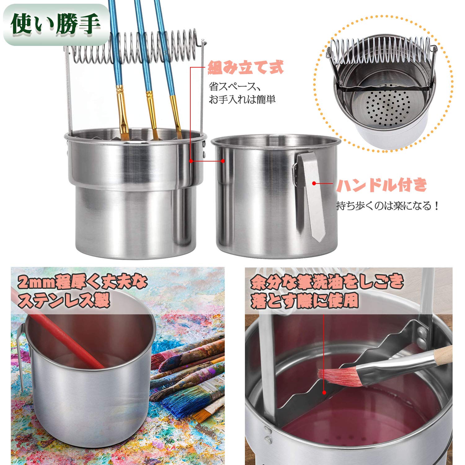 大きい筆や刷毛が洗えます。ハンドルにより、このブラシウォッシャーは持ち運びやボックスからの吊り下げが簡単になります。