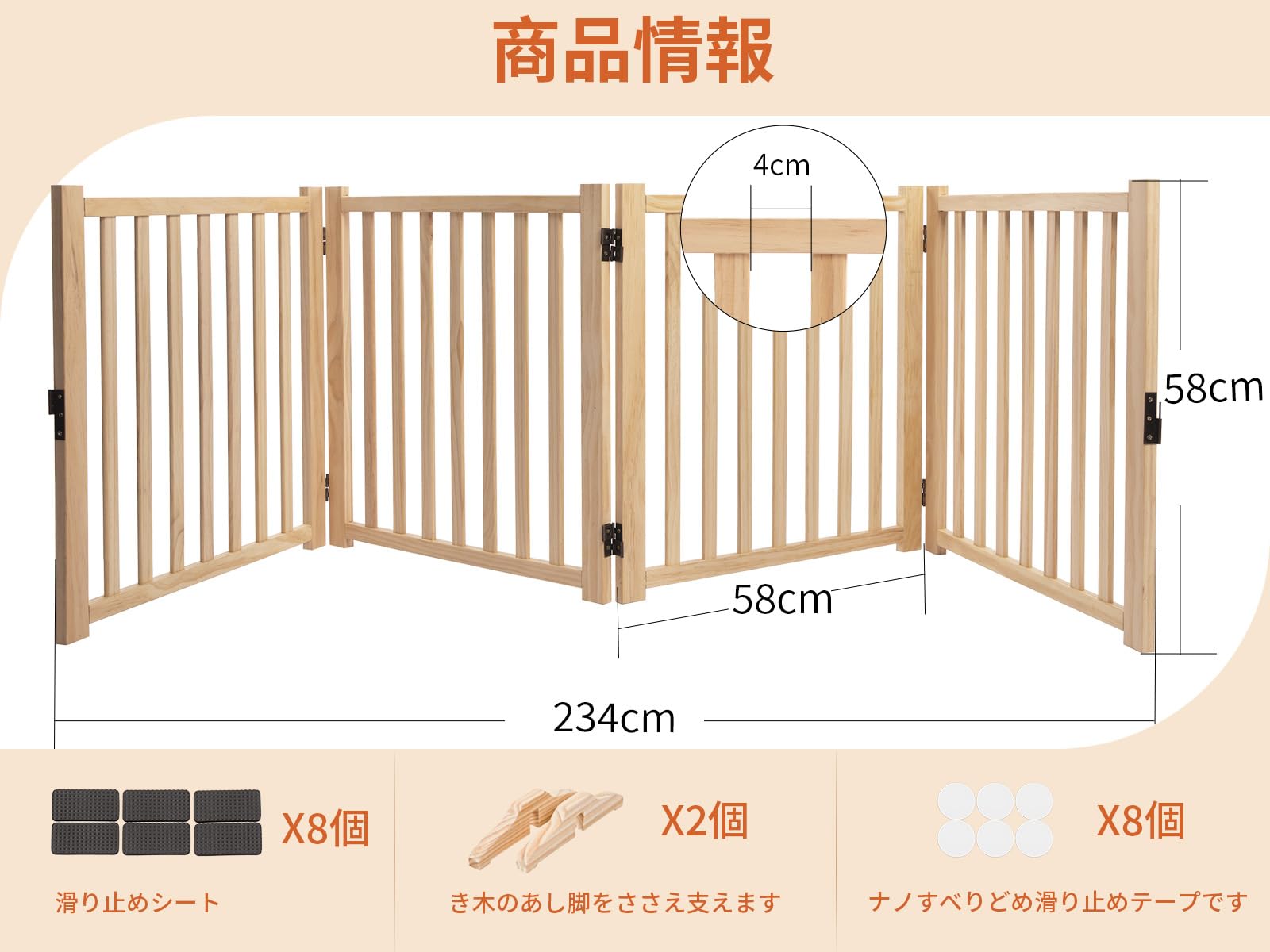 YOCAN ペットゲート ペットフェンス 高さ58cm 幅234cm 木製犬用ゲート 置くだけ 折りたたみ ついたて ペット 倒れない 飛び出し 脱走防止 中小型犬用 4枚パネル