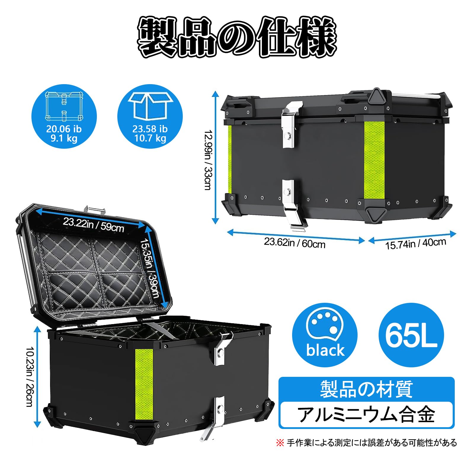 SEASAND バイク用リアボックス アルミ製品 バイクケース 手袋付き バックレスト付き スマホスタンド付き 取り付けベース付き 着脱簡単 トップケース キーロック可能 汎用 車用バッグ ツーリング/キャンプ/通勤/出前/デリバリー等 (Black, 65L)