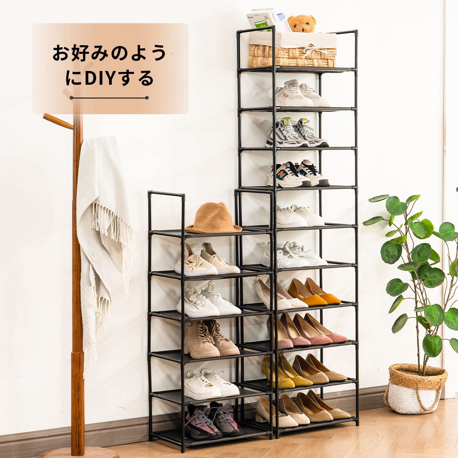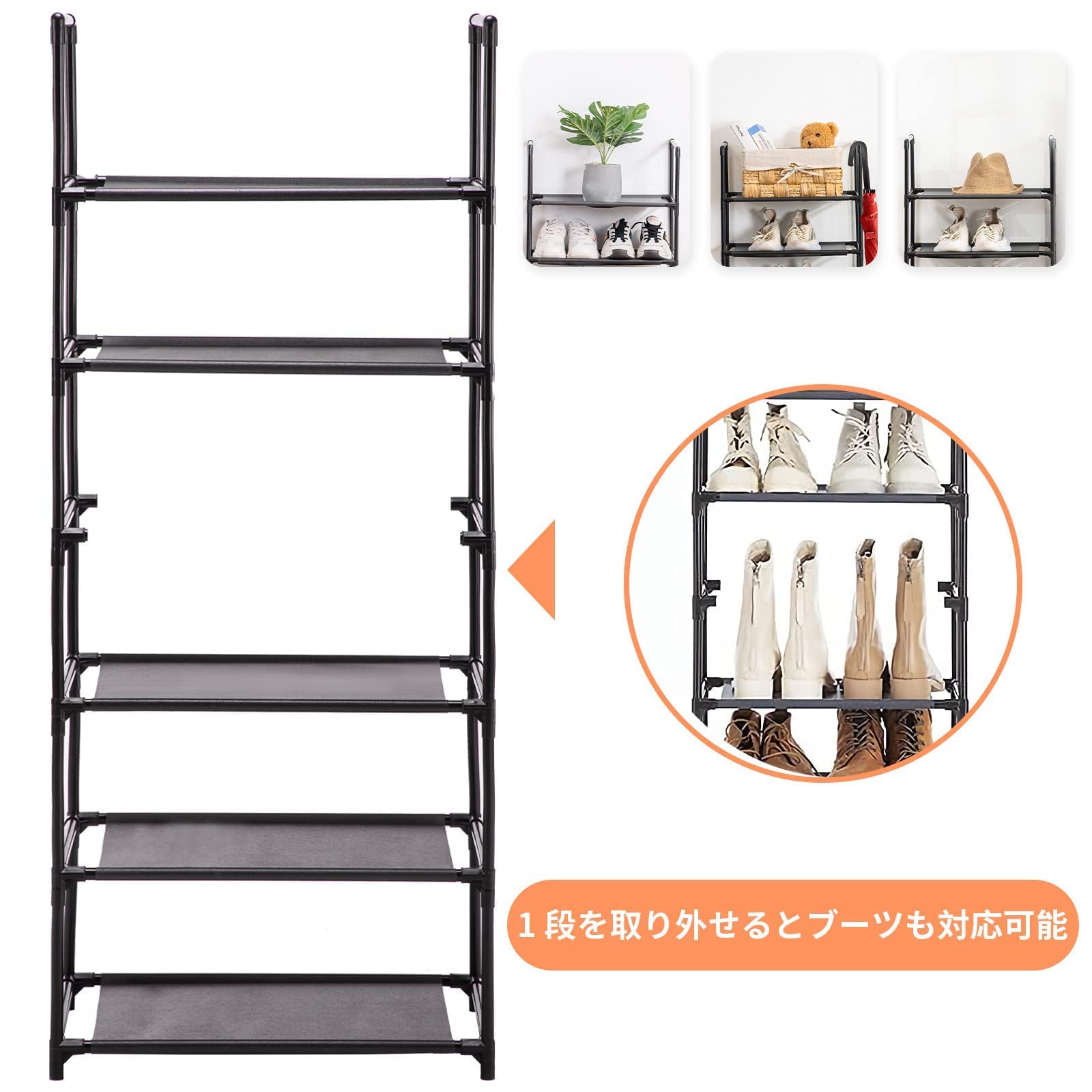 アパートの靴箱が8足ほどしか入らなくて あんまり場所をとらないよーなシューズラックが欲しくて とても安くて、サイズ感も期待以上でした! すぐ、簡単に組み立てれて軽くて意外にしっかりです。 追加のパーツも贈って非常に丁寧と思います。 収納は6段ですが、1段に2足です。 各棚の間の高さもちょうどよく、ハイトップスニーカーが入るくらいです。【一つの棚を取り外し可能なものはトールブーツに合うと思う試してみたい!!】 靴もスリッパも小物も全部置ける収納力。 部屋に置いても全然邪魔にならずに余分な靴が置けるのが嬉しい!!!