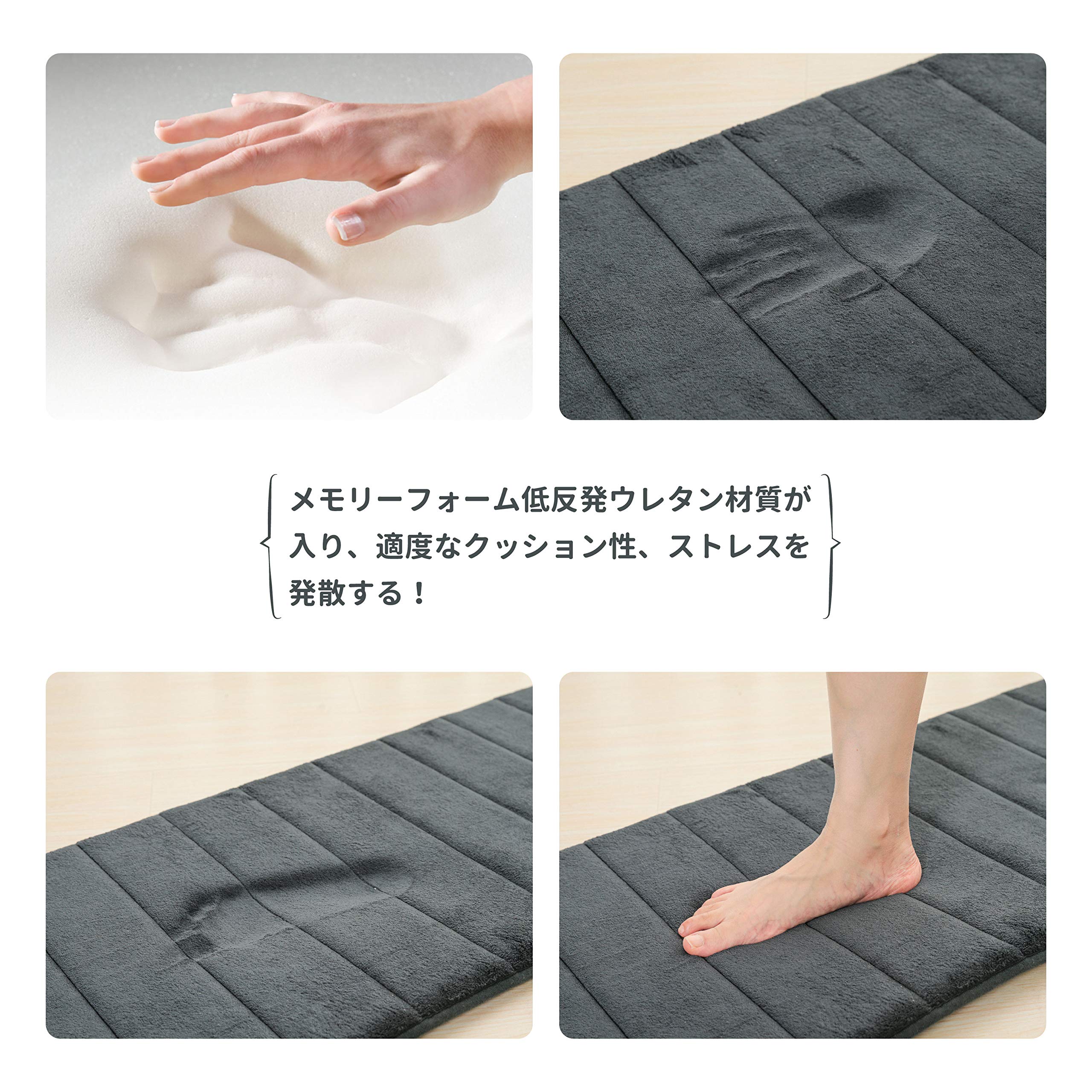柔らかくて肌触りが良い表面、クッション性に優れた低反発中材で足をふんわりと包み込むような踏み心地です。またウレタン密度が高いので底付き感もなく、冬の床の冷えも感じさせません。