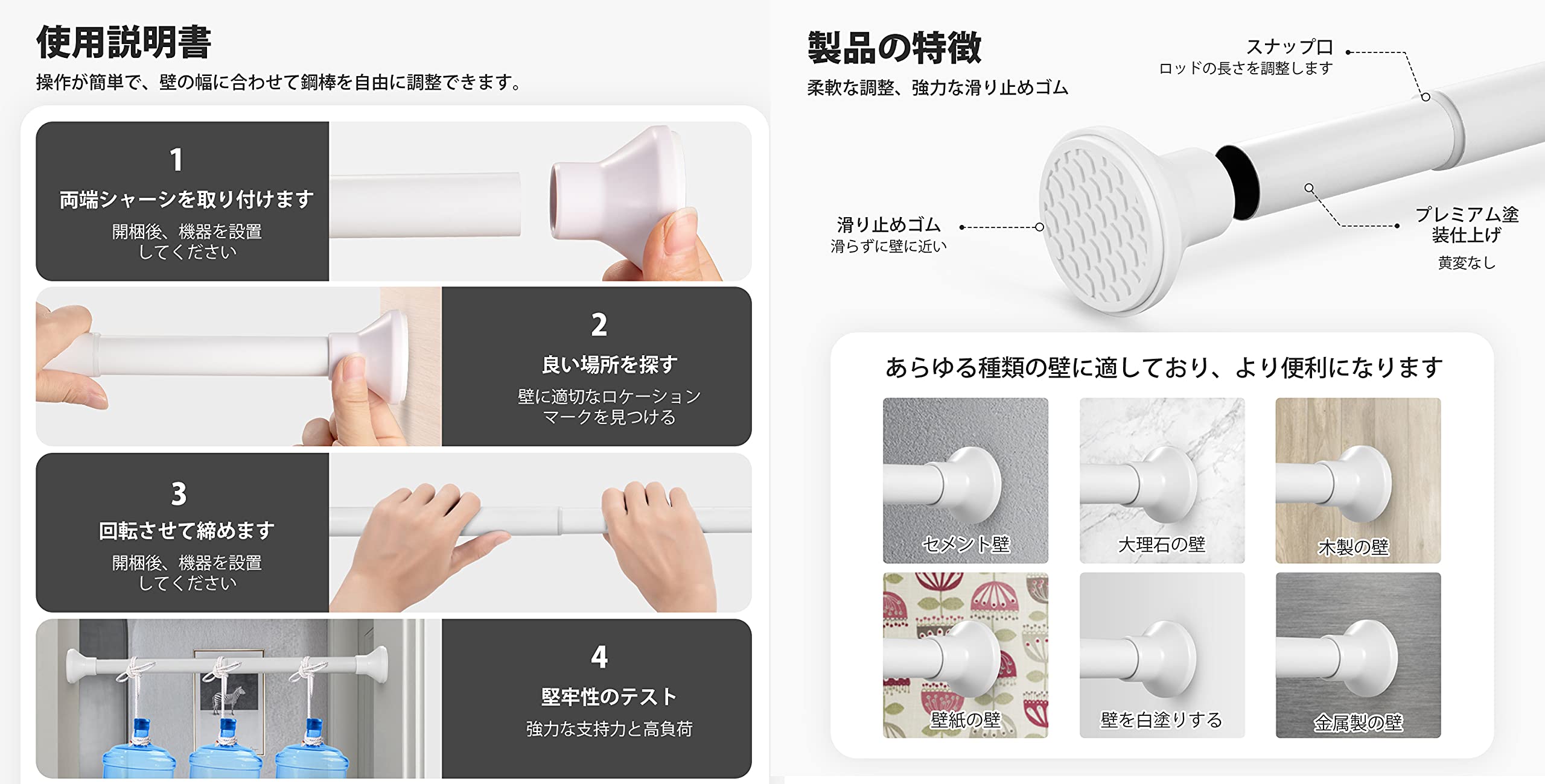 つっぱり棒収縮によって生成されるサポート力を壁にしっかりと固定して、取り付けられます。木製壁やタオルなどの様々な壁面に取り付けることができます。