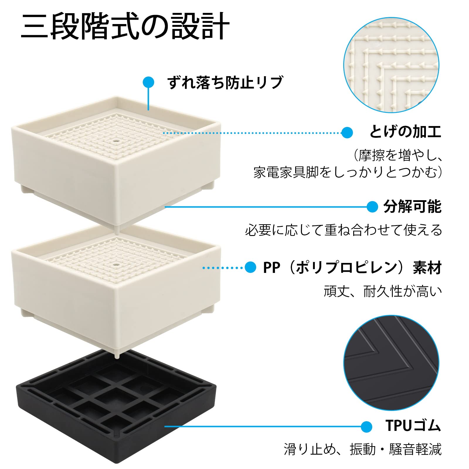 ※設置後は、必ず家電(家具)の試運転をおこない、ガタツキや振動がないが確認してください。万一、ガタツキなどが発生した場合は、必ず電源プラグを抜いてから、本品の位置調整をしてください。