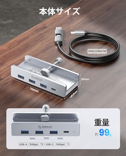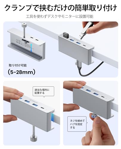 USBハブはクランプ式を採用しているので、モニターやデスクの好きな位置に固定できます。クランプとUSBハブはネジで組み合わせる設計で、省スペースです。