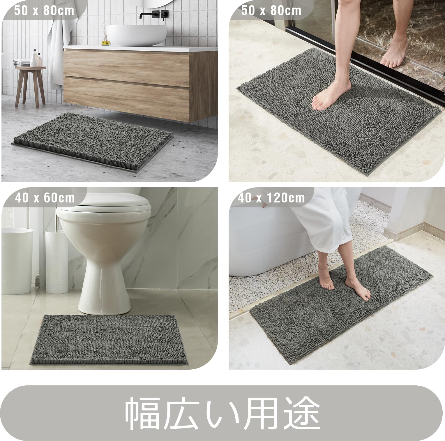 バスマット 速乾 洗える お風呂マット 足拭きマット 吸水 ふわふわ もこもこ マイクロファイバー すべり止め 浴室 玄関 洗面所 キッチン マット (グレー, 50×80cm)
