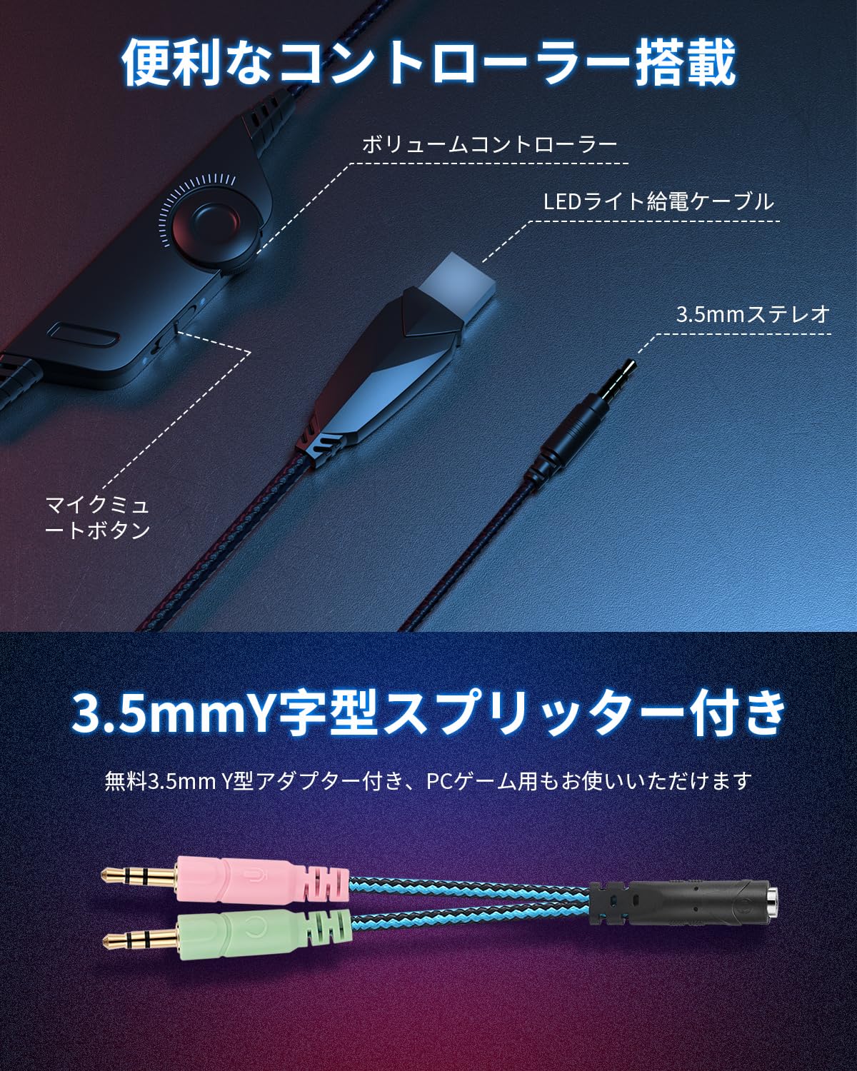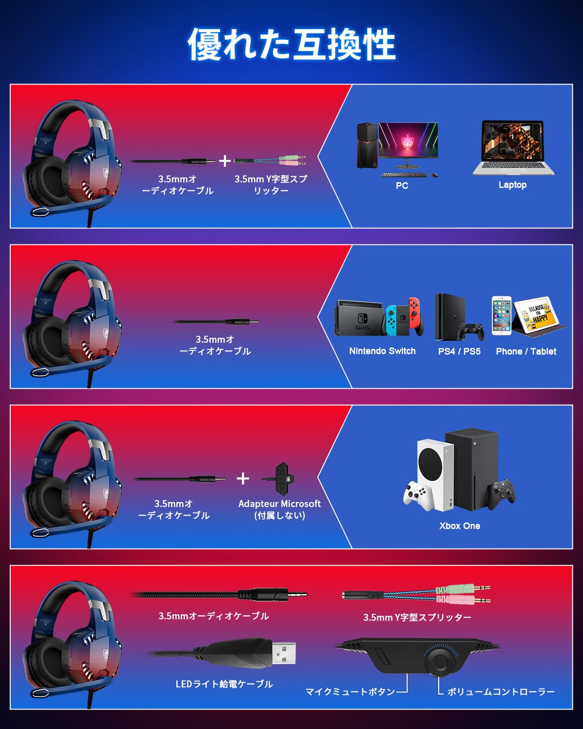 幅広い互換性。PS4、PS5、スマートフォン、パソコン、任天堂スイッチ、Xboxワンなど、さまざまなデバイスに対応しています,あなたのデバイスに差し込むだけで使用可能。無料3.5mm Y型アダプター付き、PCゲーム用もお使いいただけます。注意事項:旧型Xbox One接続には別途Microsoft Adapter(本機は付属しません)