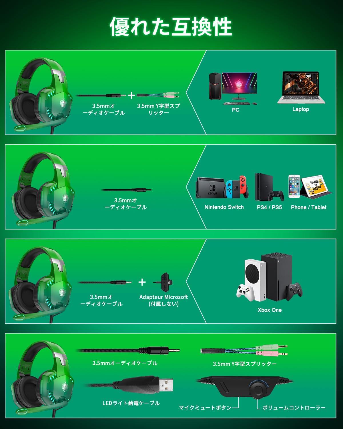幅広い互換性。PS4、PS5、スマートフォン、パソコン、任天堂スイッチ、Xboxワンなど、さまざまなデバイスに対応しています,あなたのデバイスに差し込むだけで使用可能。無料3.5mm Y型アダプター付き、PCゲーム用もお使いいただけます。注意事項:旧型Xbox One接続には別途Microsoft Adapter(本機は付属しません)