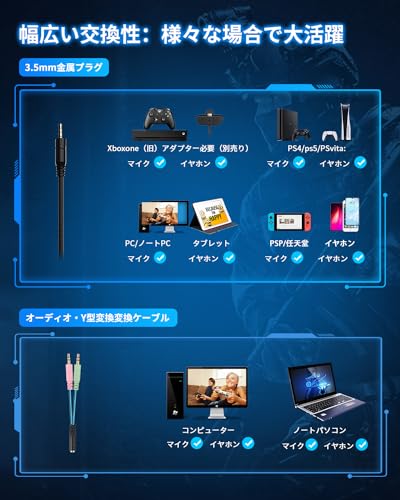 ゲーム用ヘッドホン機能では、ゲーム用ために設計されています。 これは、PS4、Xbox One、PC、任天堂 Nintendo Switchなどの3.5mmインターフェイスを備えたプロの げーむ用 ヘッドセット に適しています。 ケーブルを接続すると、ゲームでクリアでパワフルなベースステレオサラウンドサウンドを楽しめます。注意事項:旧型Xbox Oneに接続する場合は別途Microsoft Adapter(本機には付属していません)が必要となります。