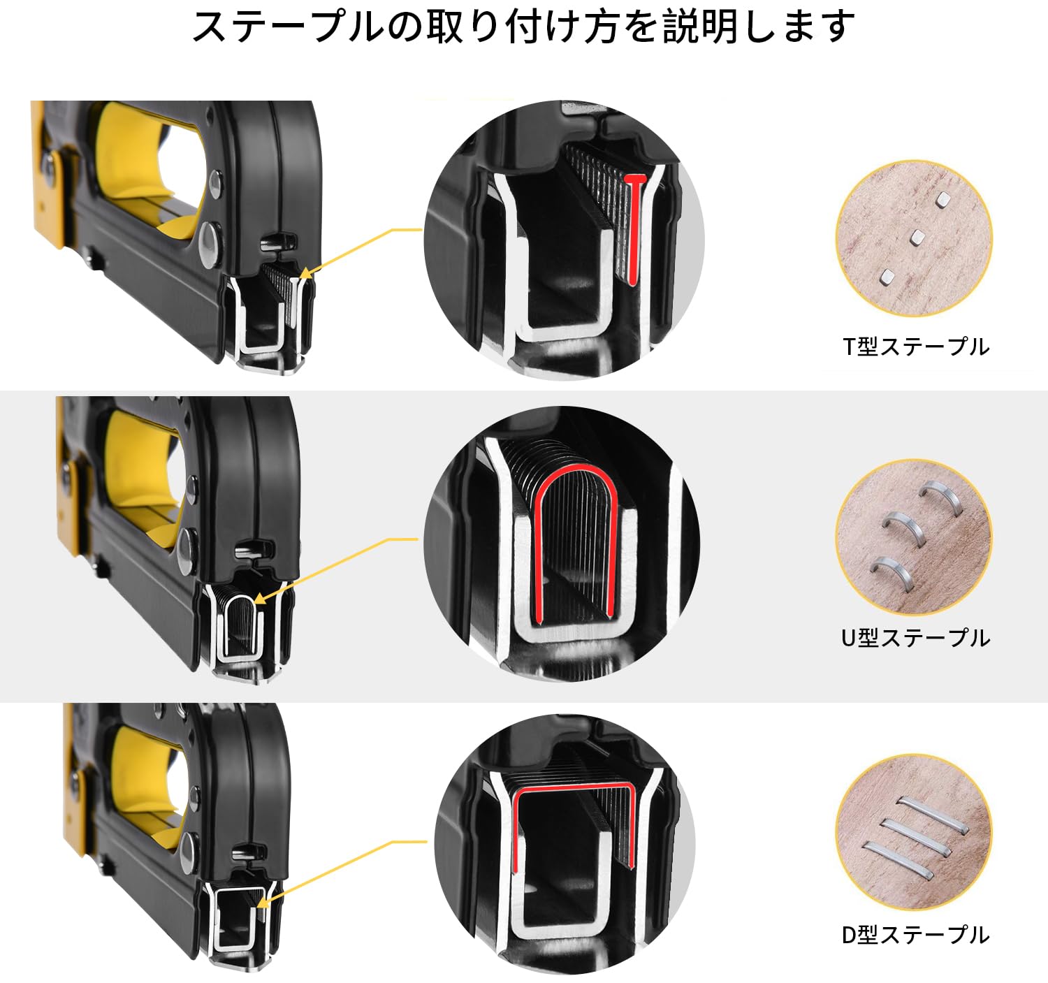 コ型・U型・I型の3種の針・ステープルに対応しています。合板木工、建築、貼り付け、固定作業などステープルを使用目的に合わせてお選びいただけます。