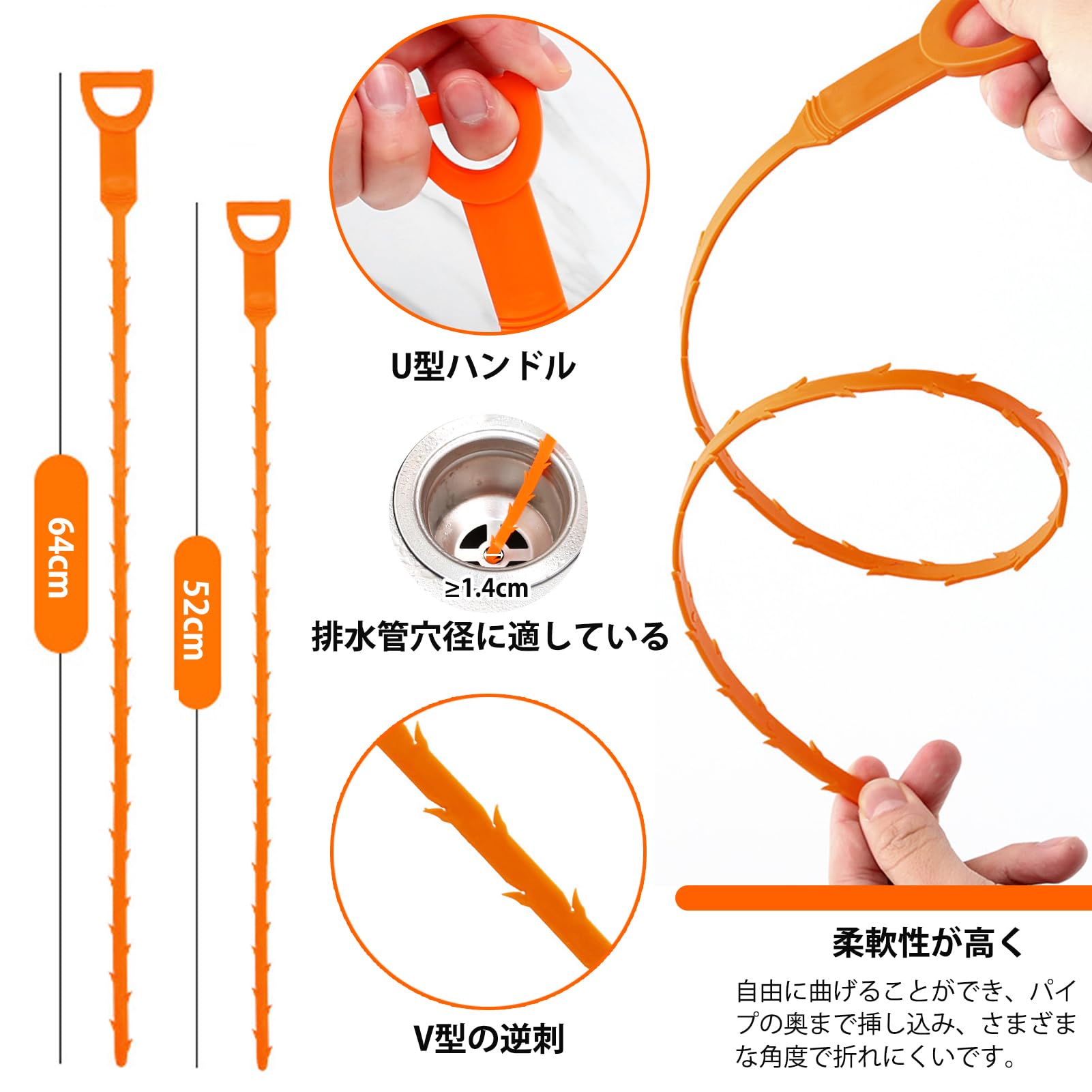 【曲げられる柔軟性】パイプクリーナーとパイプ掃除ブラシは排水管の形状に合わせて任意の形状に曲げることができます。それに、オレンジのパイプヘアーキャッチは柔軟性の高い PP 素材で作られ、蓄積した髪の毛や食べ物、ゴミ、その他の詰まりを効果的に取り除くことができます。