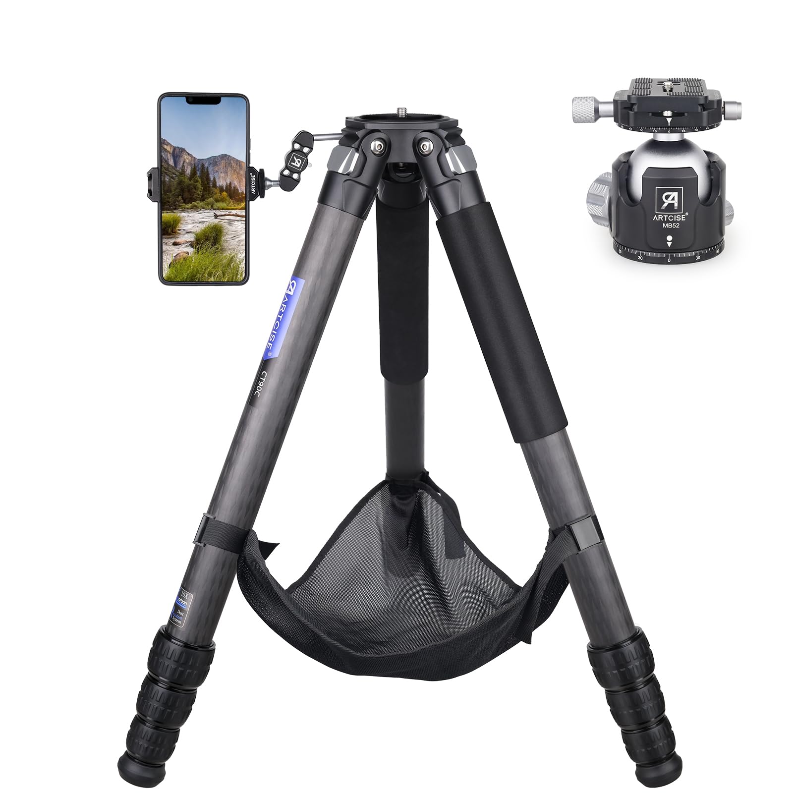 【超安定なカーボン三脚】CT90Cカメラ三脚は10層高品質なカーボンファイバー素材を採用して、40mm最大管経レッグと52mmボールの低重心三脚は良い安定性を提供します。メインなジョイント部品は剛性が高いアルミ合金でCNC精密加工して、頑丈で安定した構造となっています。荷物を掛けるための重力フックがあり、もっと高い安定性を実現できます。自重:3キロ、使用高度:22.8cm-171.3cm、最大耐荷重:40キロ。