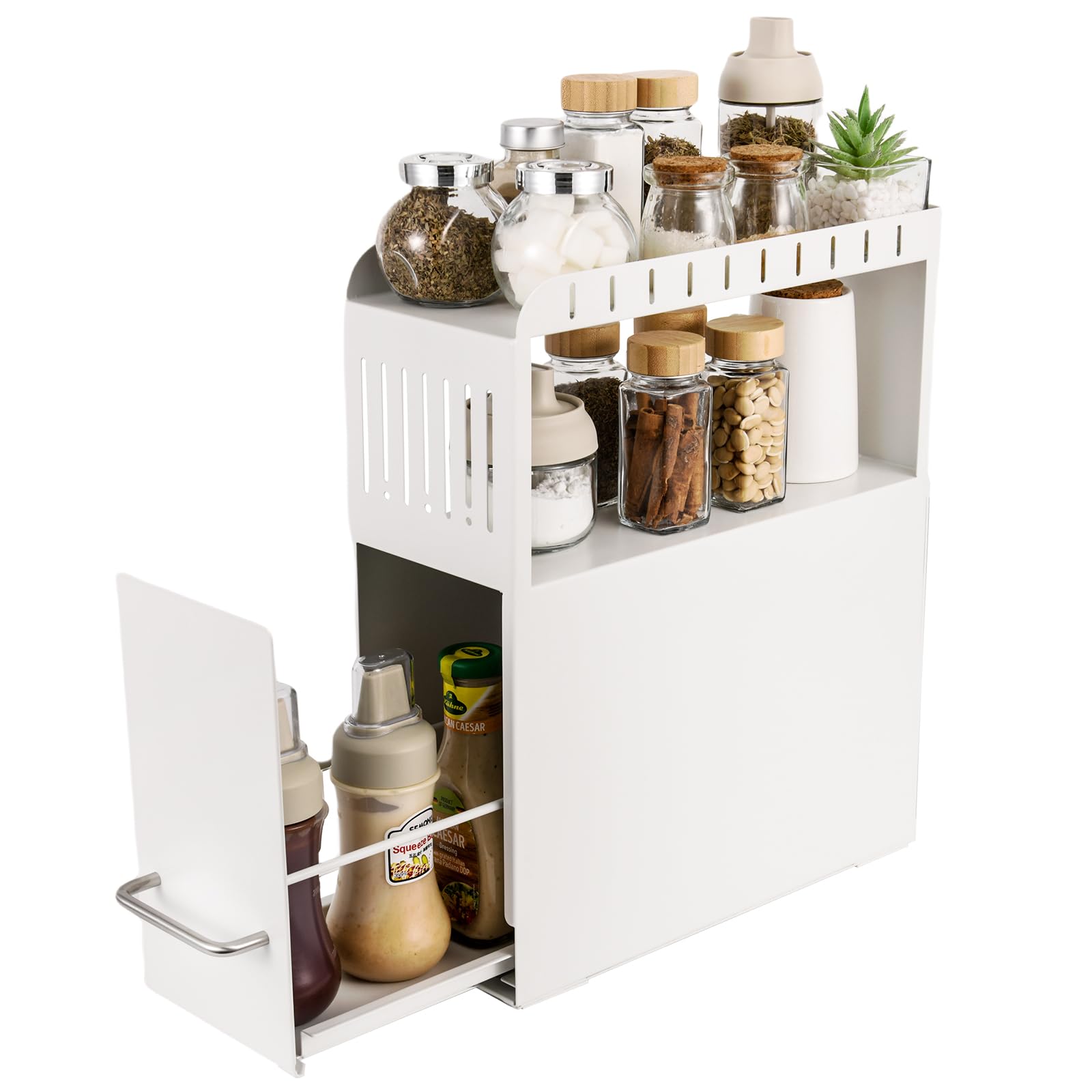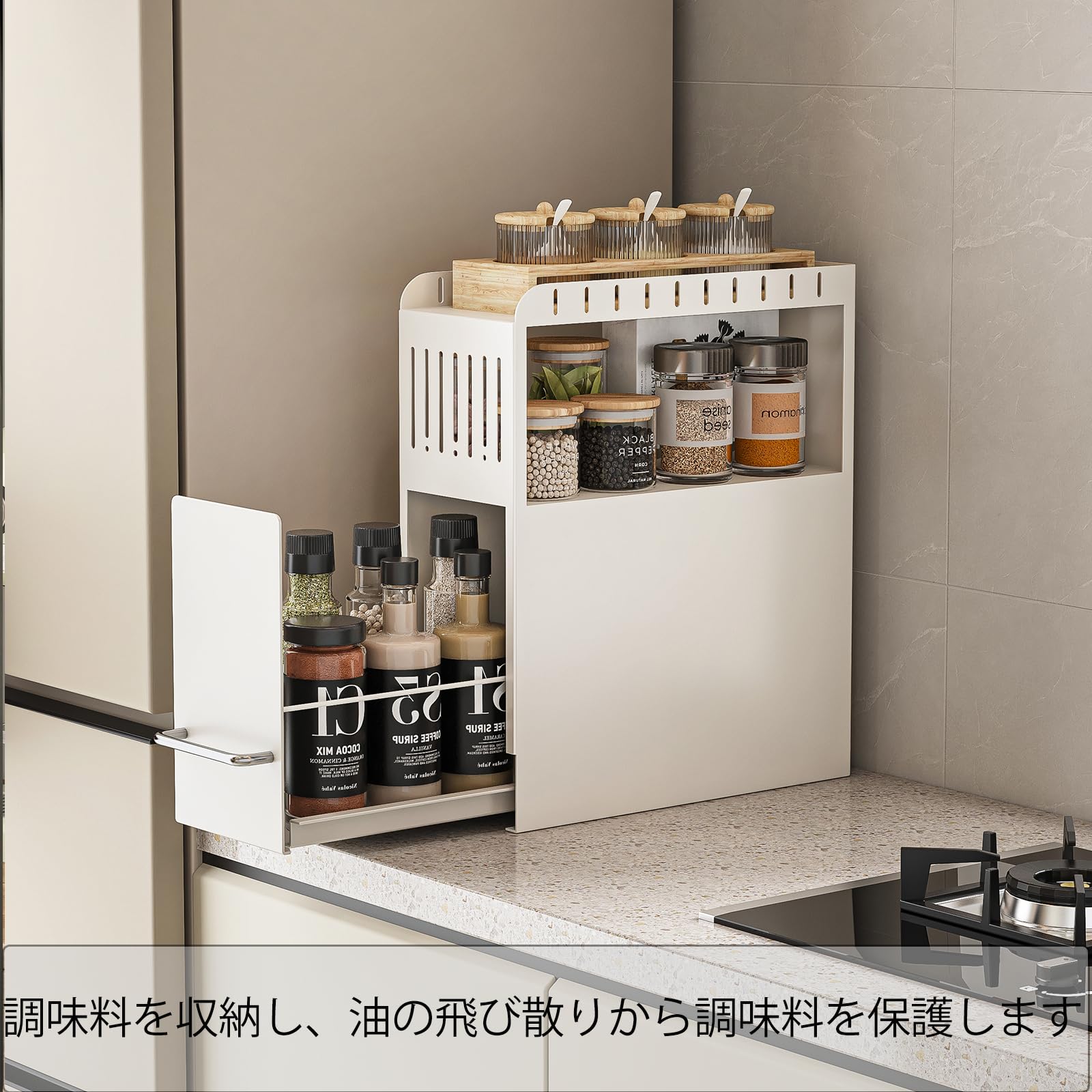 コンロのそばに置ける隠し調味料ラック!一段式と二段式の調味料ラックがあり、大容量で収納できます。隠し調味料ラックは調味料を隠すことができ、油はねやほこりを防ぎます。上段には小さな調味料ボトルを置き、下段には醤油や油などの大きなボトルの液体調味料を置くことができます。