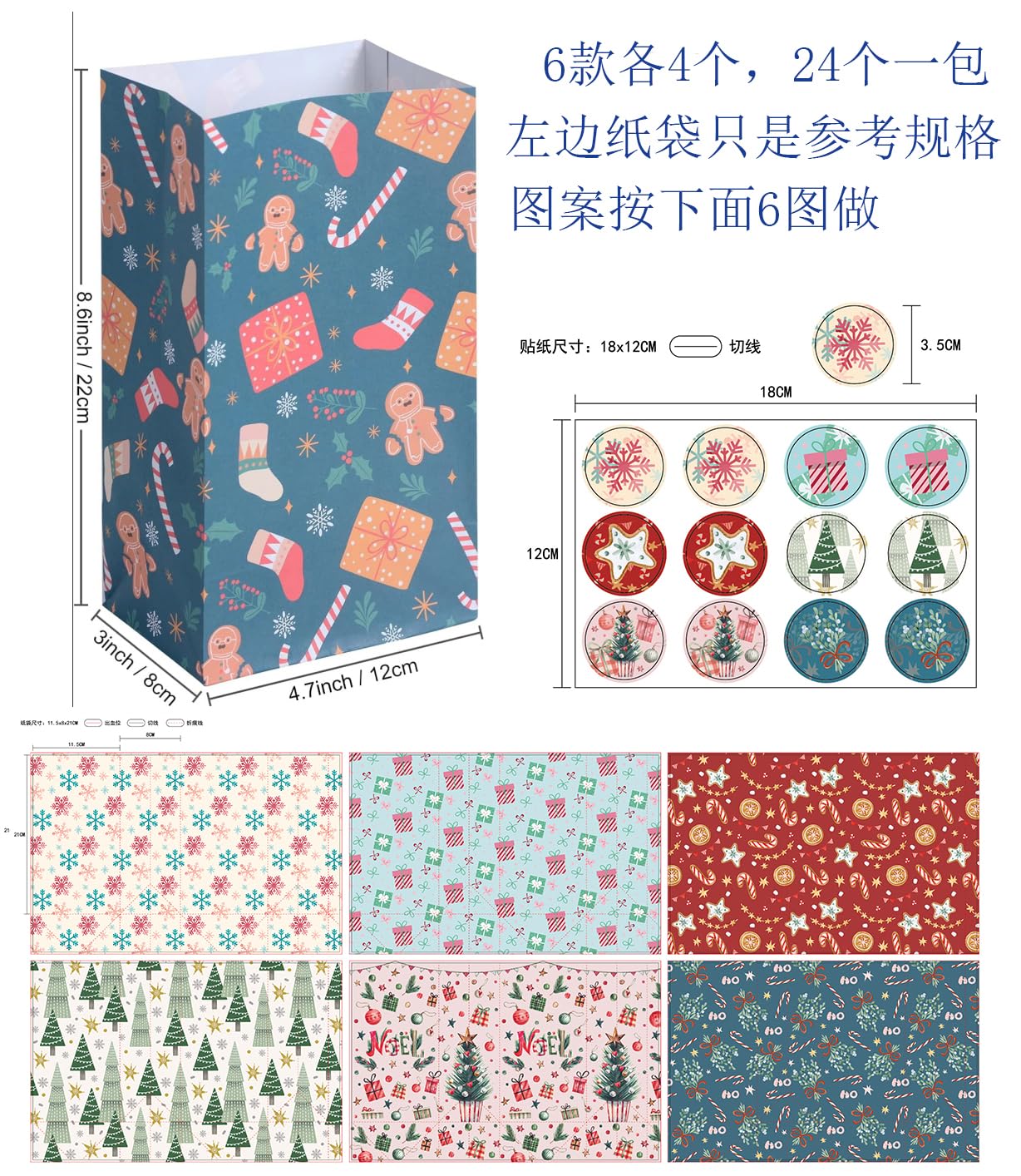 Kesote クリスマス ラッピング 袋 小 紙袋 24枚入 クリスマス 袋 らっぴんぐ袋 角底袋 クリスマスプレゼント 包装 ラッピング クリスマス ラッピング 小袋 ペーパーバッグ プチギフト ギフトバッグ 24枚シール付き