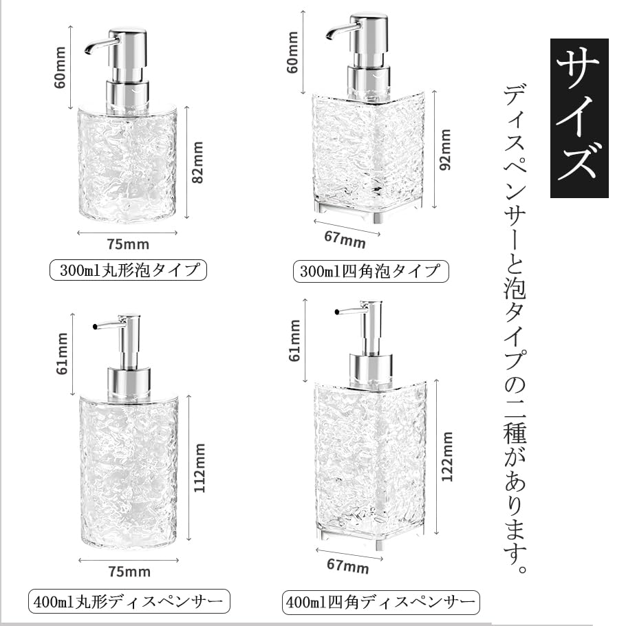 説明 【仕様】 素材:プラスチック サイズ: 400ml四角液体タイプ:68mmx68mmx185mm 400ml丸形液体タイプ:75mmx75mmx175mm 300ml四角泡タイプ:68mmx68mmx145mm 300ml丸形泡タイプ:75mmx75mmx145mm