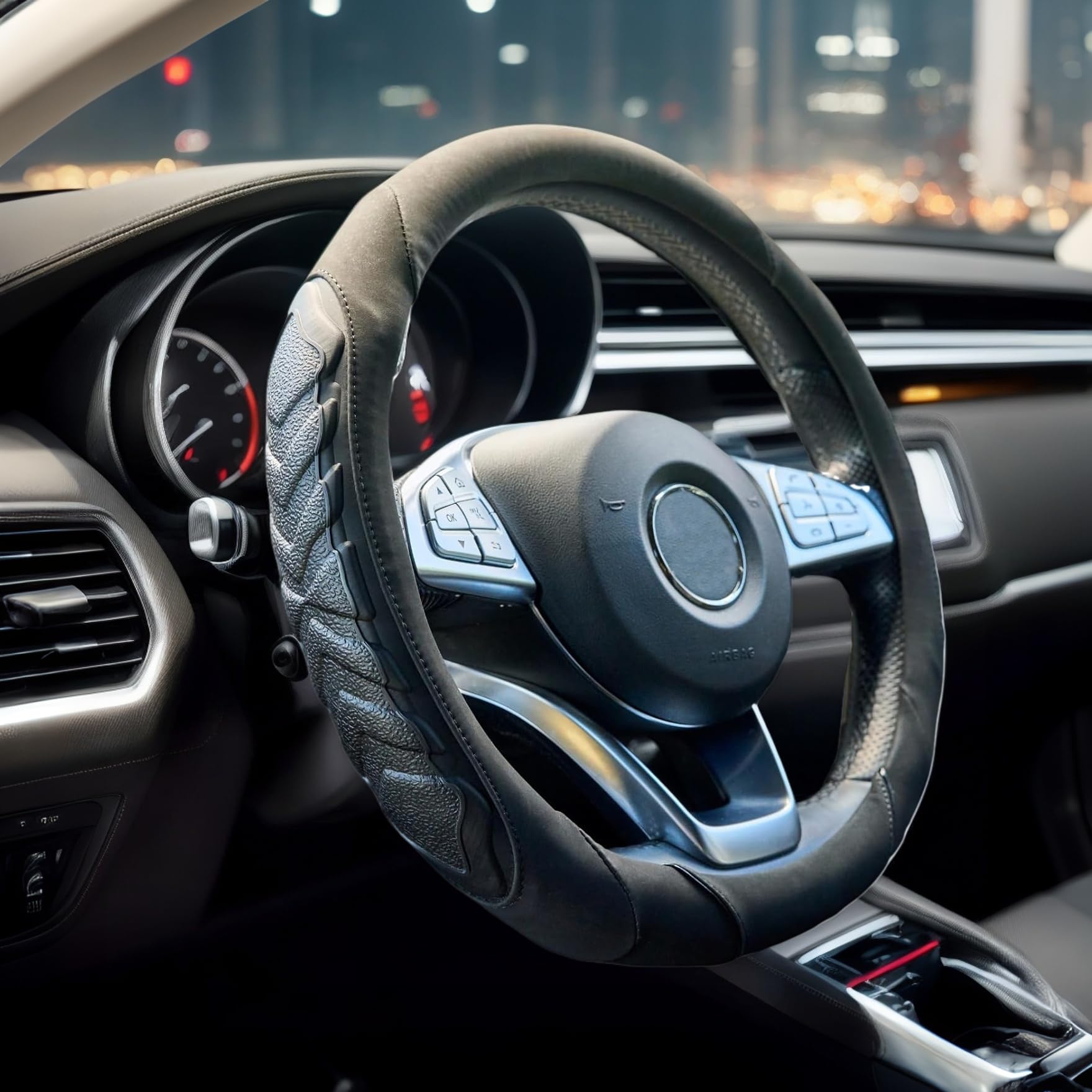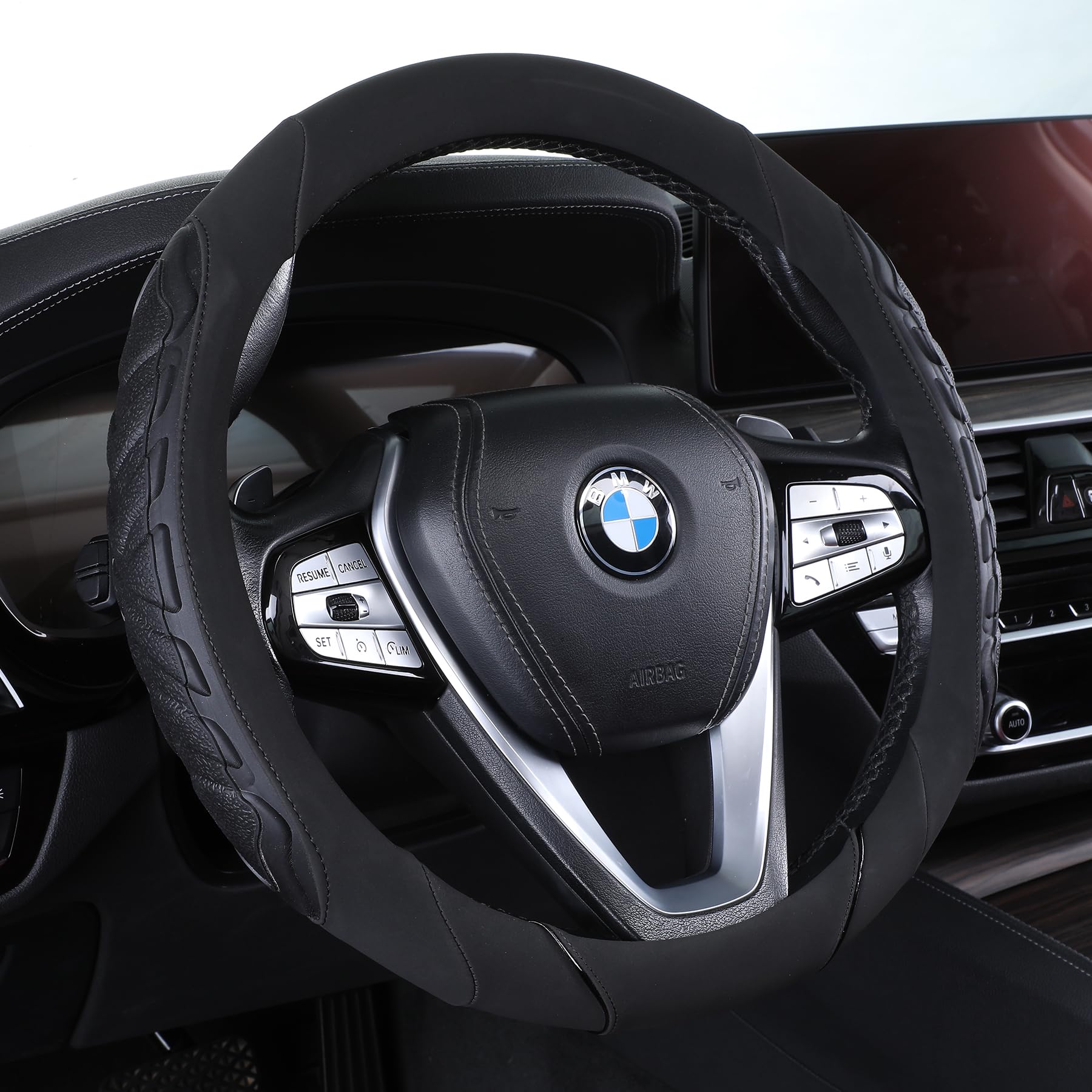 PICKSHI ハンドルカバー スエード ステアリングカバー 3Dグリップ 高級 超薄型S ・M・Lサイズ、O型 D型 幅広い車種で使用可能 暖かい 冬手は冷たくない 夏汗の吸収 滑らない 取付簡単 軽自動車、普通車、軽トラック汎用 (ブラック)
