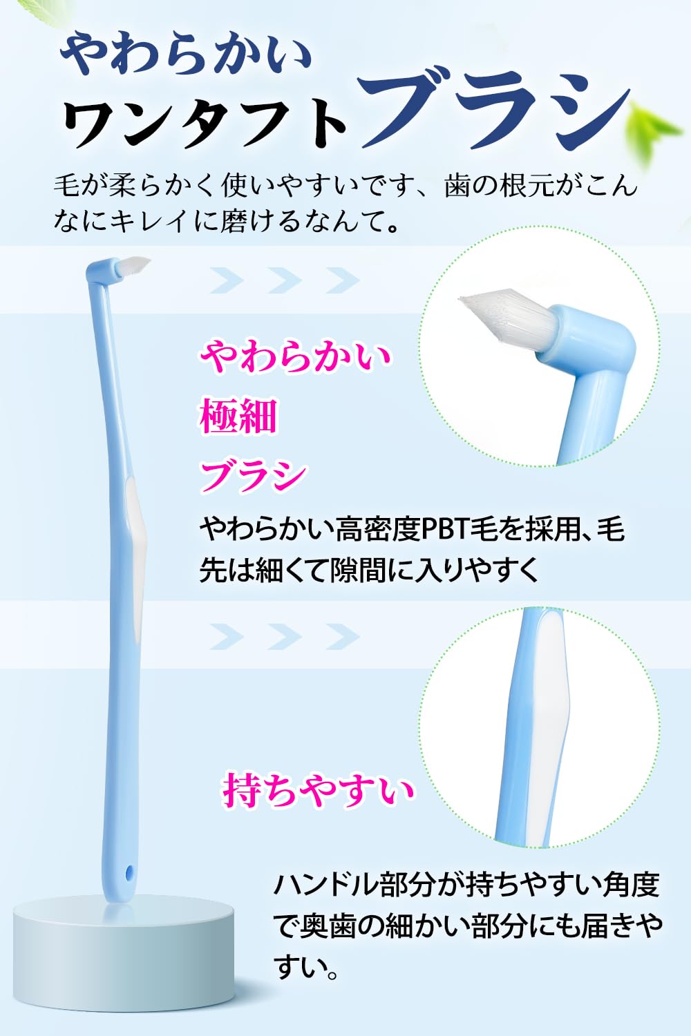 【やわらかい高密度毛、ワンタフトブラシ】やわらかい高密度PBT毛を採用、毛先は細くて隙間に入りやすく、程よいコシがあって歯茎には優しく、でもしっかりと汚れも落とせます。極細の歯ブラシが歯の隙間に入り使いやすいです。