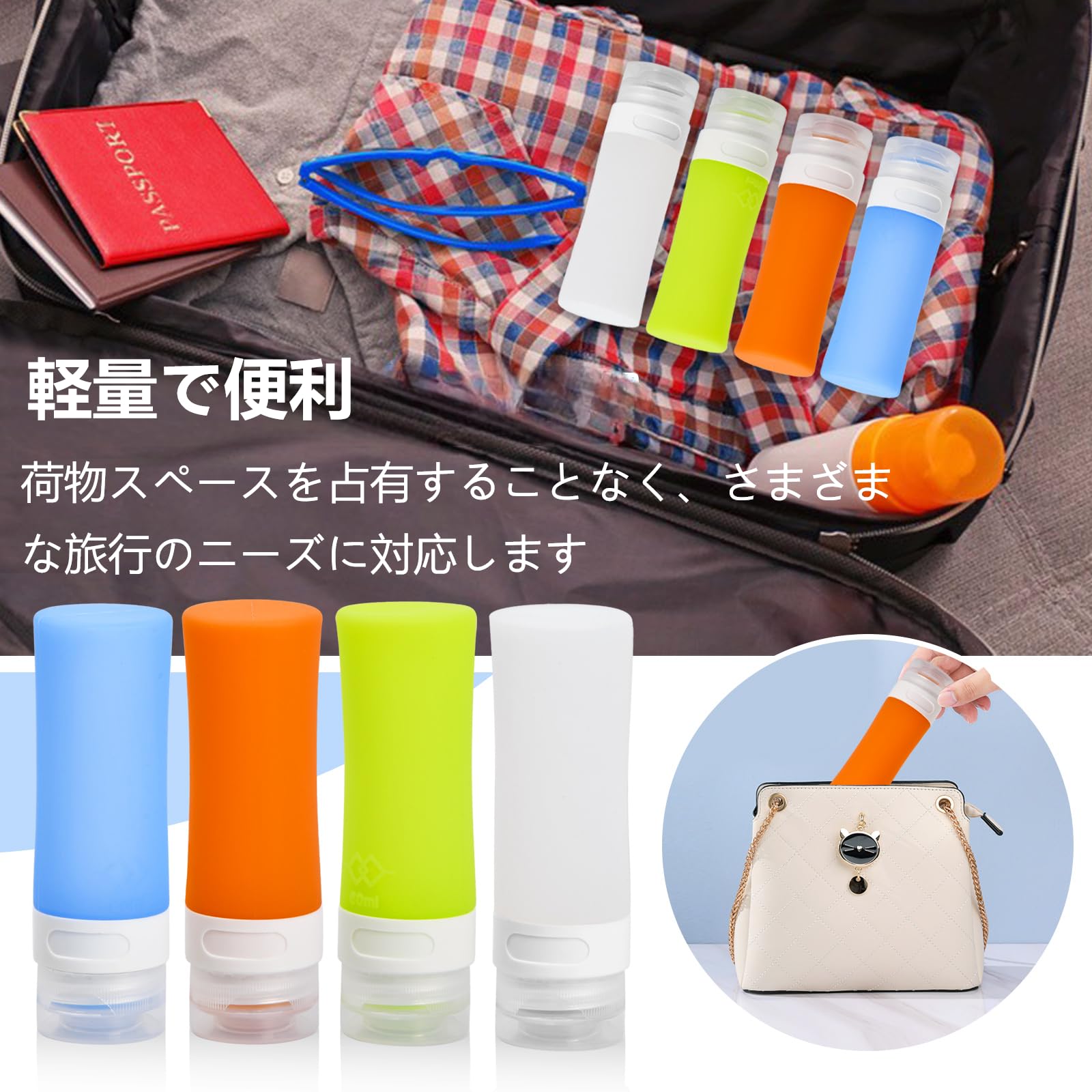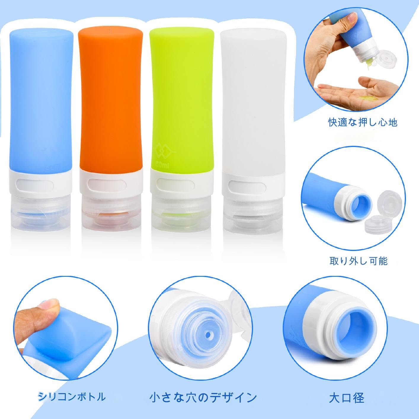 製品の説明:<0--> ???? シリコン製トラベルボトルセット、アクティブなライフスタイルのための再利用可能なトイレタリー容器セット。 ???? これらの軽量トラベル容器は、旅行のお供に最適です。旅行、キャンプ、その他のアウトドア活動に最適です。 商品の詳細: 数量: 1パックあたり4個 色: ホワイト、ブルー、グリーン、オレンジ 素材: シリコン 容量: 60 ml / 2.1 オンス サイズ: 約 3.6 x 3.6 x 11.2 cm / 1.42 x 1.42 x 4.41 インチ パッケージサイズ: 約 20 x 17 x 3.5 cm / 7.87 x 6.69 x 1.38 インチ パッケージ重量: 133g 特徴: ❥ このセットには、容量がそれぞれ60ml / 2.1オンスのシリコン製トラベルボトルが4個含まれています。 ❥ シリコン製で、柔らかくて握りやすいです。 ❥ 開口部が広いデザインなので、シャンプーやボディウォッシュを入れやすく、ブラシを使ってボトルの内側を掃除することもできます。 ❥ 3層の漏れ防止設計により、液体の漏れを防ぎ、バックパックや荷物に安全に保管できます。 ❥ 異なる色のボトルは、液体を区別するのに役立ちます。 注意: ◆ パッケージには空のローション容器のみが含まれており、他のアイテムは写真撮影用小道具としてのみ使用され、含まれていません。 ◆ 撮影プロセス中、照明、カメラ、ディスプレイ設定などの要因により、写真の実際の色は製品の実際の色と若干異なる場合があります。 ◆ 製品サイズは手動で測定されており、若干の違いがある場合があります。