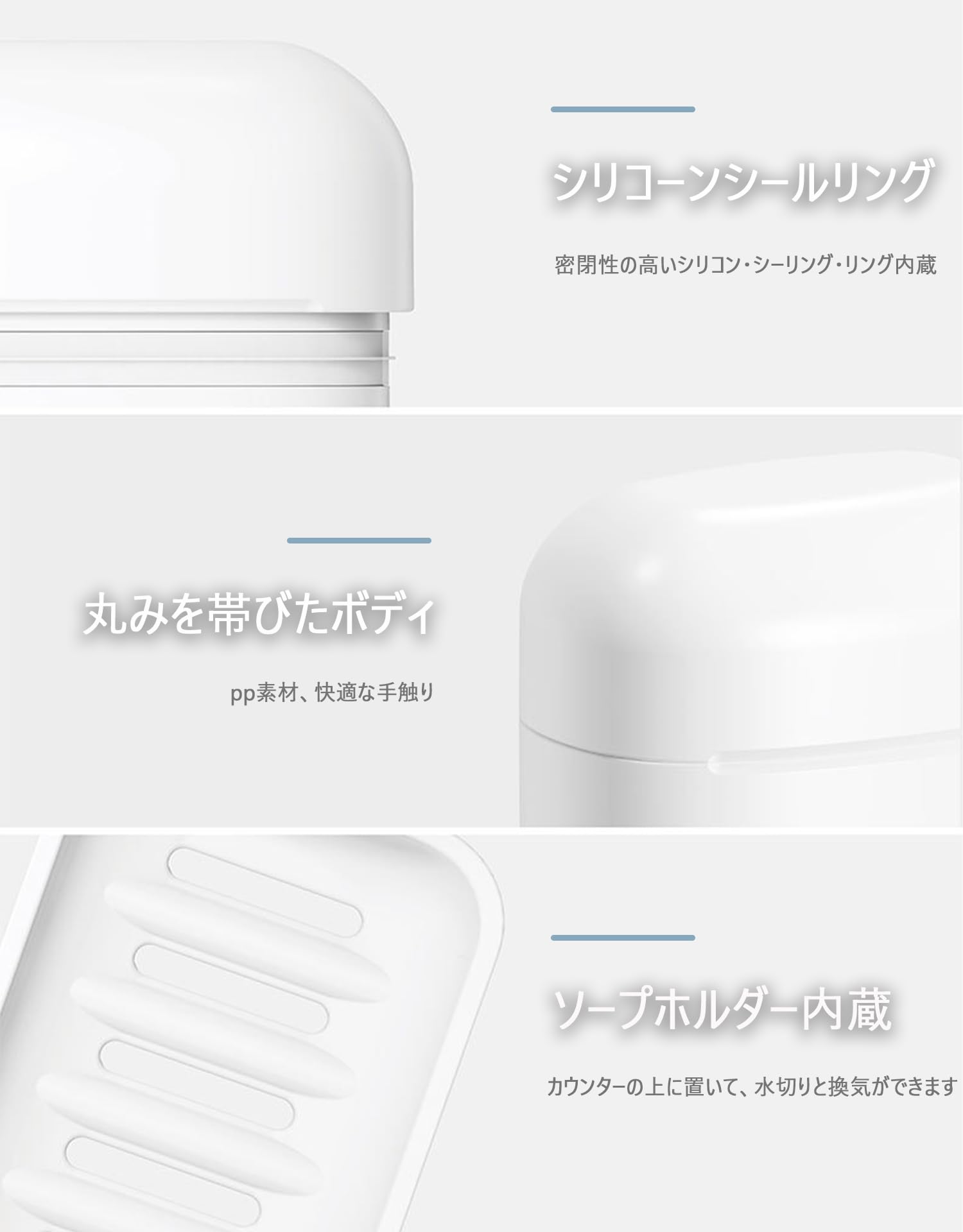 【シンプルなデザイン】丸みを帯びた外観で、スタイリッシュでシンプルなデザイン。内蔵の水切りトレイ、石鹸が濡れるのを防ぎ、旅行中に石鹸を乾いた状態に長持ちします