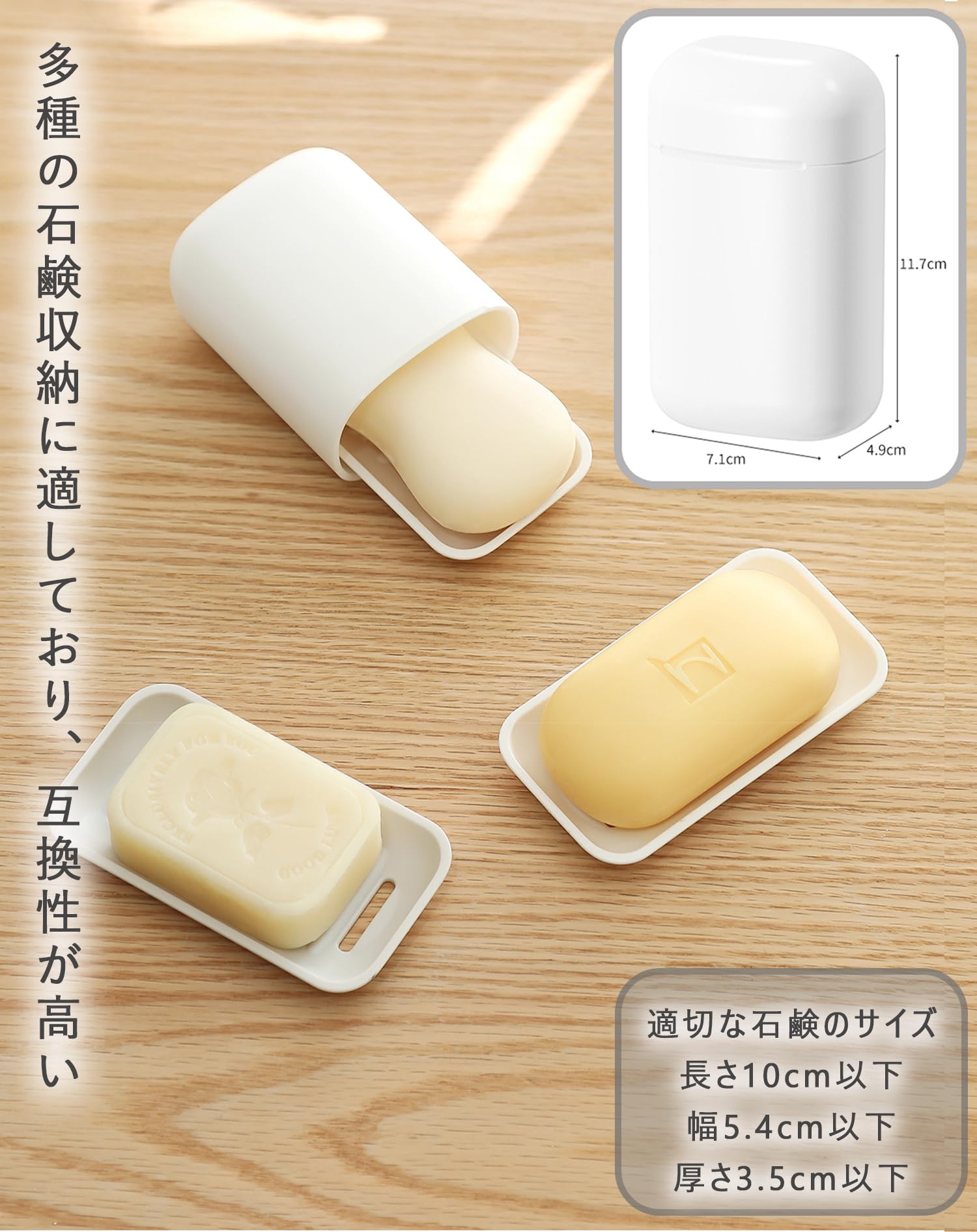 【商品仕様】ソープボックスのサイズ:約7.1×4.9×11.7cm、トレイサイズ: 約10.3x5.2 cm。重さ:75g。長さ 10 cm 、幅 5.4 cm 以内のさまざまな石鹸に適しています。小さくて精巧、大人も子供も使用に適しています