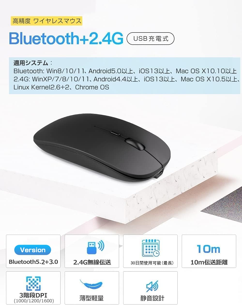 ワイヤレスマウスはbluetooth5.2/3.0も2.4Gも対応でき、さいだい10m通信距離、また、光学式なので、トラッキング性が向上し、高い読み取り性能を実現できます。