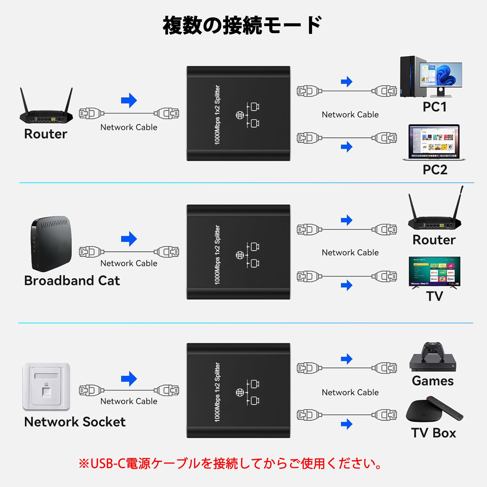 このlan 分配器は、PC、サーバー、プリンター、ルーター、スイッチ、メディアプレーヤー、NAS、VoIP電話、PoEデバイスなど、RJ45ジャックを備えたすべてのデバイスに適しています。
