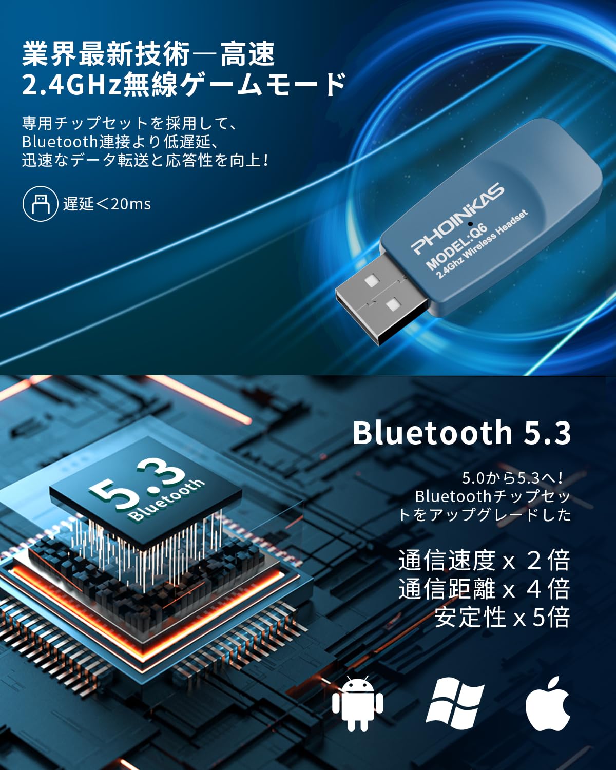 Bluetoothモードの音声信号はSBCです。一般的状況で、Bluetoothモード/2.4G無線モードでボイスチャットが自動的に連接します