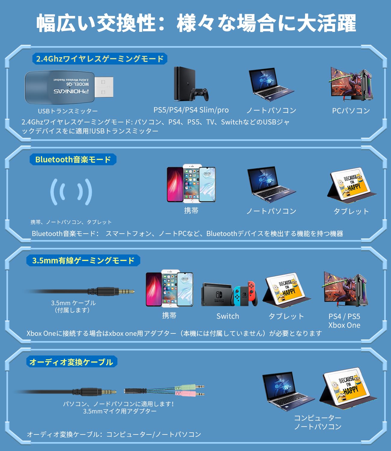 【3.5MM有線接続】PS4/5、Switch、PC、Xbox、xboxone、3.5mmケーブルで連接できるデバイス。PCと接続する場合は付属の3.5mmアダプター使用必要です※ご注意:有線でXbox ゲーム機に利用する場合はヘッドセット変換アダプターが必要です(別途購入)。PCでマイク使用する場合は付属の3.5mmアダプター使用必要です。